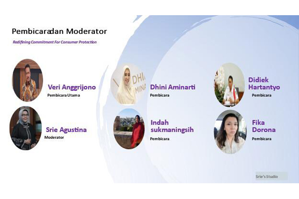 Hadir sebagai narasumber pada webinar kali ini yaitu Direktur Jenderal Perlindungan Konsumen dan Tertib Niaga, Veri Anggrijono; Direktur Marketing PT Mayora Indah Tbk, Fika Darana; Direktur PT Kereta Api Indonesia (KAI), Dadan Rudiansyah; Penggiat Perlindungan Konsumen, Indah Suksmaningsih; dan Duta Wardah Indonesia, Dhini Aminarti; serta dipandu oleh Widyaswara Ahli Utama Kementerian Perdagangan, Srie Agustina.