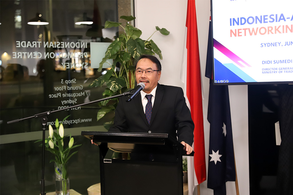 Direktur Jenderal Pengembangan Ekspor Nasional, Didi Sumedi menghadiri acara Business Networking Session Sydney Build Expo yang diselenggarakan di Kantor Indonesian Trade Promotion Center (ITPC) Sydney, Australia, Rabu (1 Juni). Acara ini merupakan ajang pertemuan antara delegasi pengusaha Indonesia dengan buyer potensial sektor bahan bangunan di Australia.
