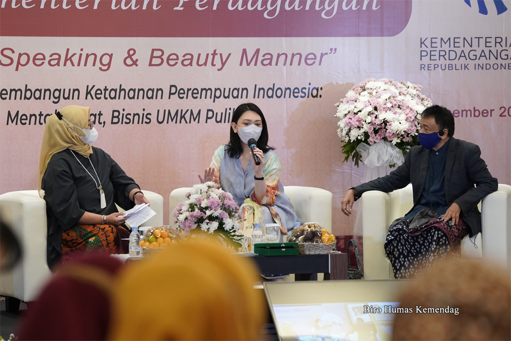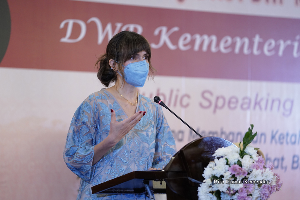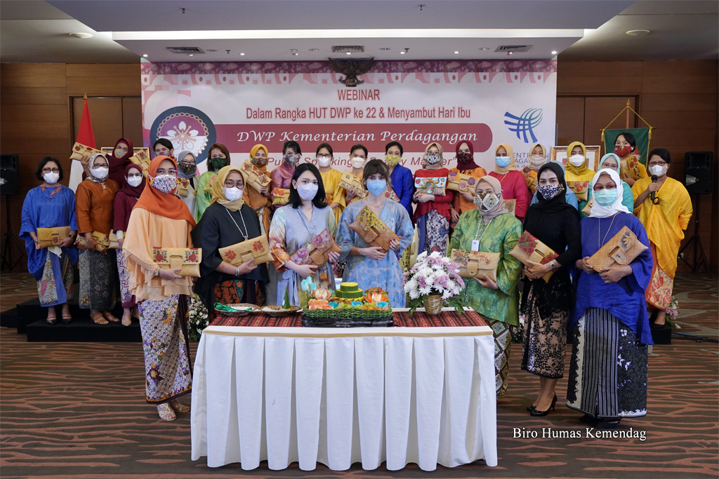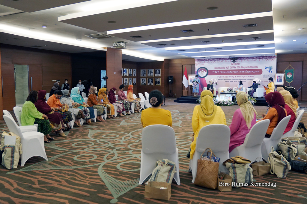 Dharma Wanita Persatuan (DWP) Kementerian Perdagangan menggelar Webinar Public Speaking and Beauty Manner dengan tema "Bersama Membangun Ketahanan Perempuan Indonesia; Mental Sehat, Bisnis UMKM Pulih" di Kantor Kementerian Perdagangan, Jakarta, Kamis (9 Des). Acara tersebut dipimpin langsung oleh Penasihat DWP Kemendag, Bianca Muhammad Lutfi.