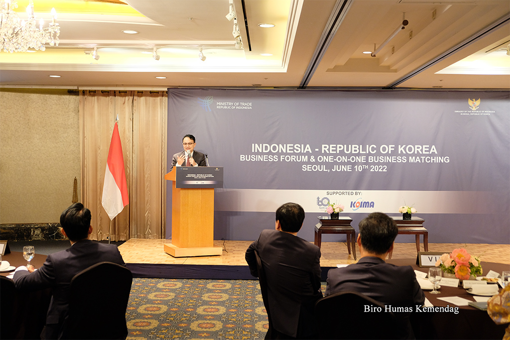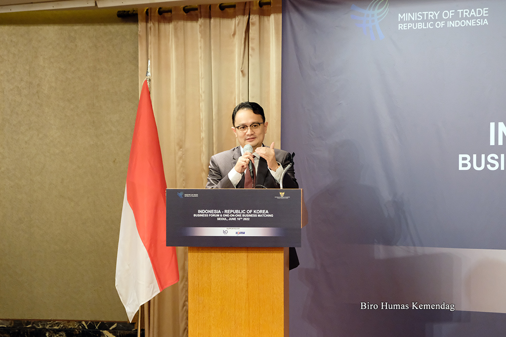 Wakil Menteri Perdagangan RI, Jerry Sambuaga memberikan sambutan kunci pada Forum Bisnis Indonesia-Korea yang digelar di Lotte Hotel, Seoul, Korea Selatan, pada Jumat (10 Juni). Acara dibuka oleh Dubes RI Seoul, Gandi Sulistyanto dan dihadiri perusahaan Indonesia, serta asosiasi dan importir Korea Selatan.