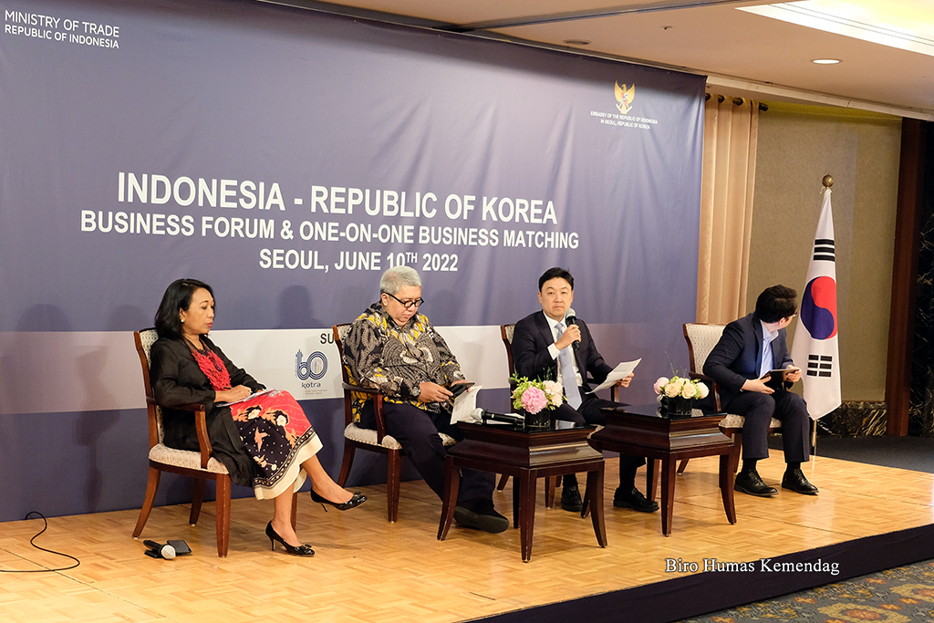 Kegiatan dilanjutkan dengan diskusi panel "Strengthening Trade, Investment, and Economic Partnership Between Indonesia-Republic of Korea" dengan narasumber Sekretaris Jenderal KADIN Indonesia Komite Bilateral Korea, Lee Joo Haan; Ketua Asosiasi Pengusaha Retail Indonesia (APRINDO), Roy N. Mandey; dan Director of Global Business Development at NODA Labs, Hunhee Cho Esq, serta dipandu oleh Direktur Kerja Sama Pengembangan Ekspor, Ni Made Ayu Marthini.
