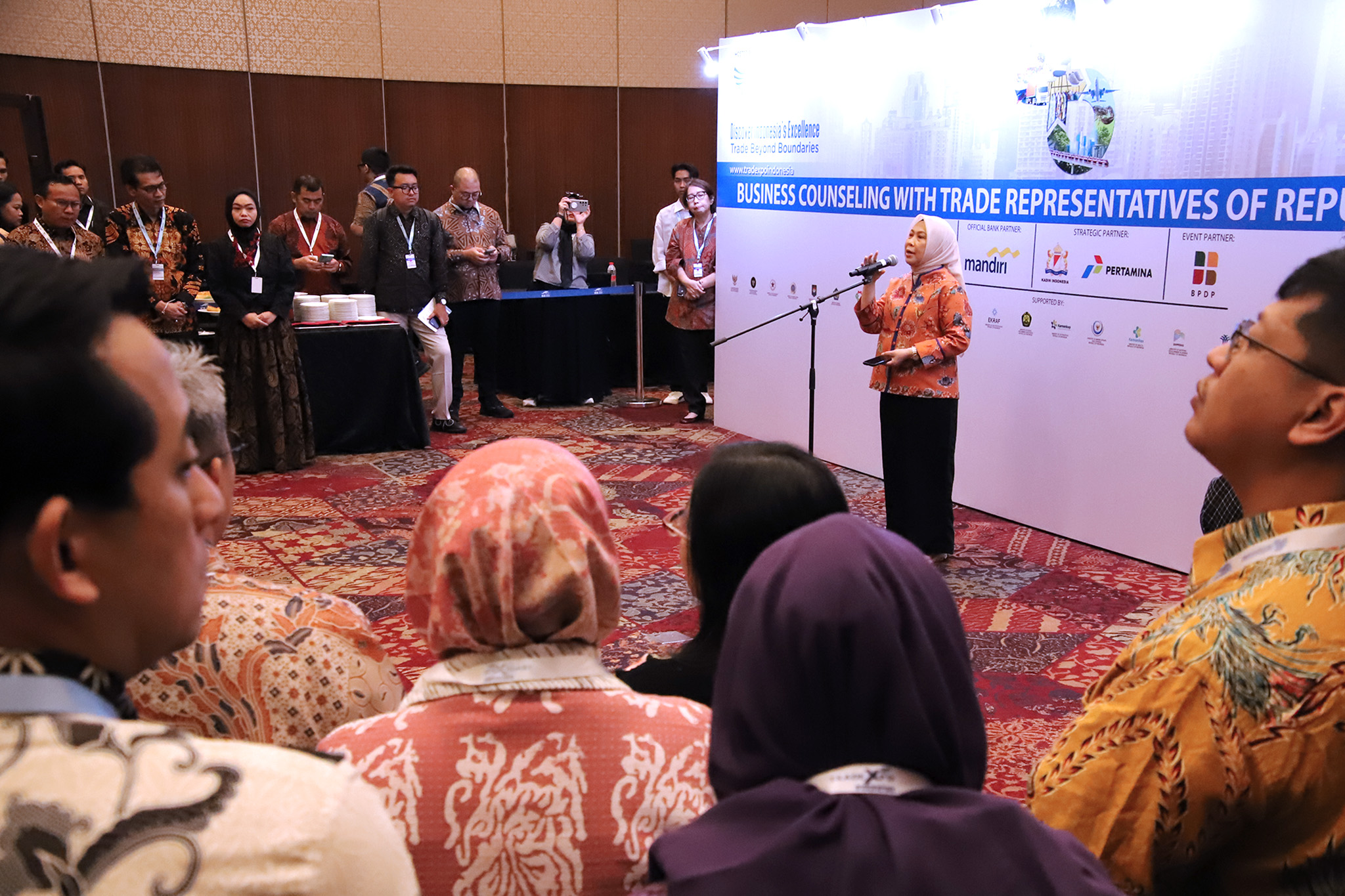Kementerian Perdagangan menggelar konsultasi bisnis (business counseling) antara pelaku usaha dengan para perwakilan perdagangan (perwadag) RI di luar negeri terkait akses untuk melakukan penetrasi pasar ke luar negeri dalam rangkaian Trade Expo Indonesia ke-40 di ICE BSD, Tangerang, Banten, Jumat (17 Okt). Kegiatan ini dibuka oleh Direktur Jenderal Pengembangan Ekspor Nasional, Fajarini Puntodewi.