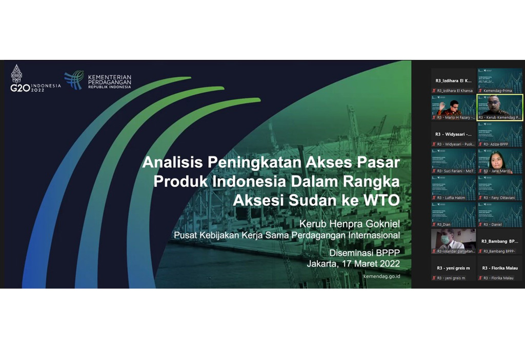 Kementerian Perdagangan menyelenggarakan Diseminasi Hasil Analisis Tahun 2022 secara virtual, Kamis (17 Mar). Acara dibuka oleh Kepala Badan Pengkajian dan Pengembangan Perdagangan (BPPP), Kasan.