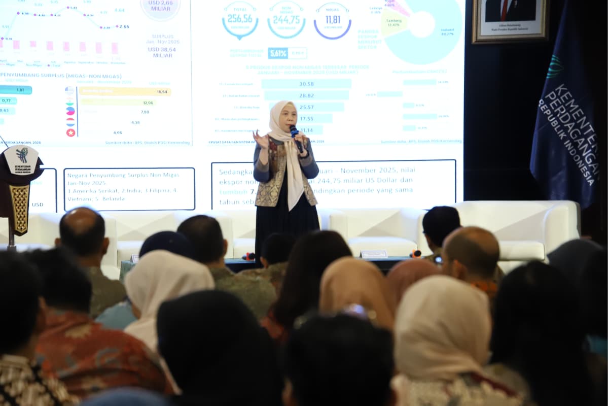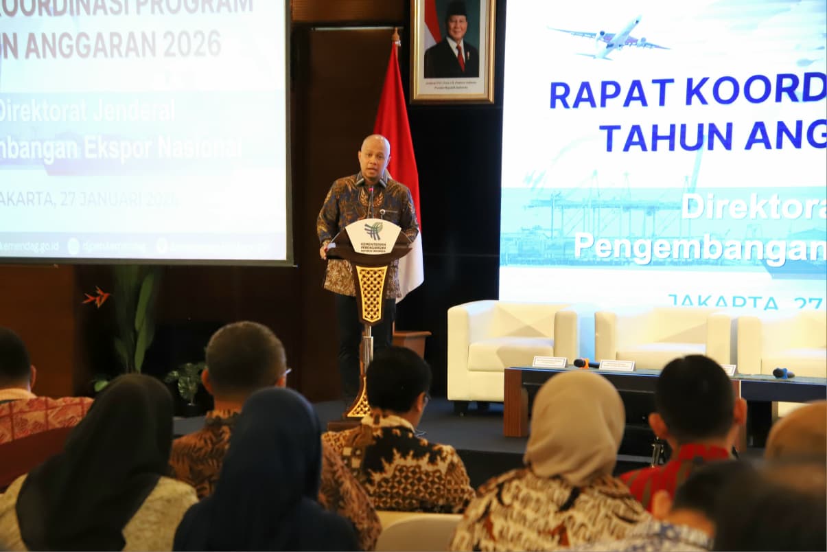 Direktur Jenderal Pengembangan Ekspor Nasional, Fajarini Puntodewi membuka Rapat Koordinasi Program Tahun Anggaran 2026 di Auditorium Kementerian Perdagangan, Jakarta, Selasa (27 Jan).