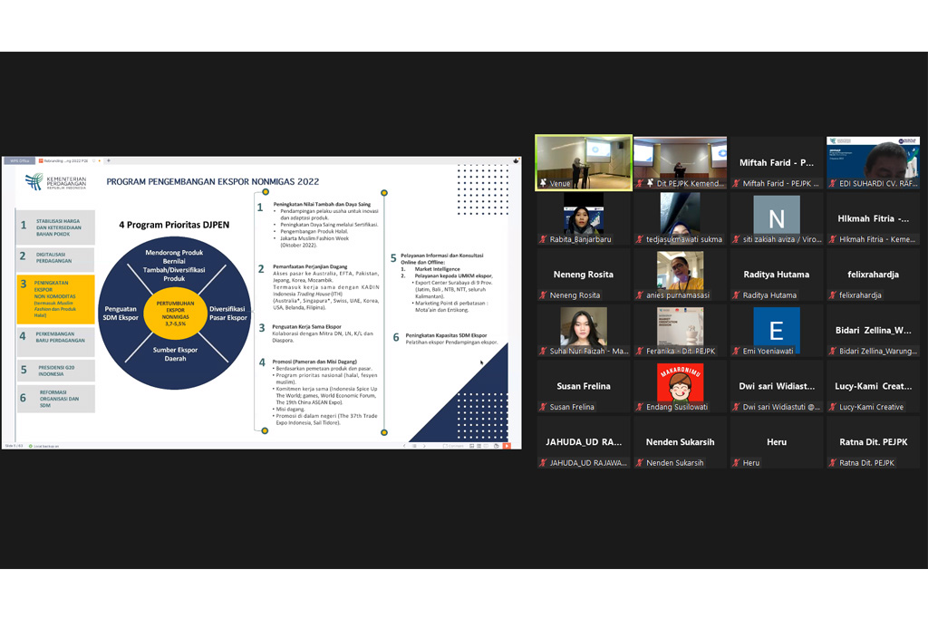 Direktur Pengembangan Ekspor Jasa dan Produk Kreatif, Miftah Farid membuka secara daring Seminar “Pengembangan Merek Produk Ekspor, Ekspansi Ekspor Melalui Branding” di Malang, Jawa Timur, Rabu (3 Agt).