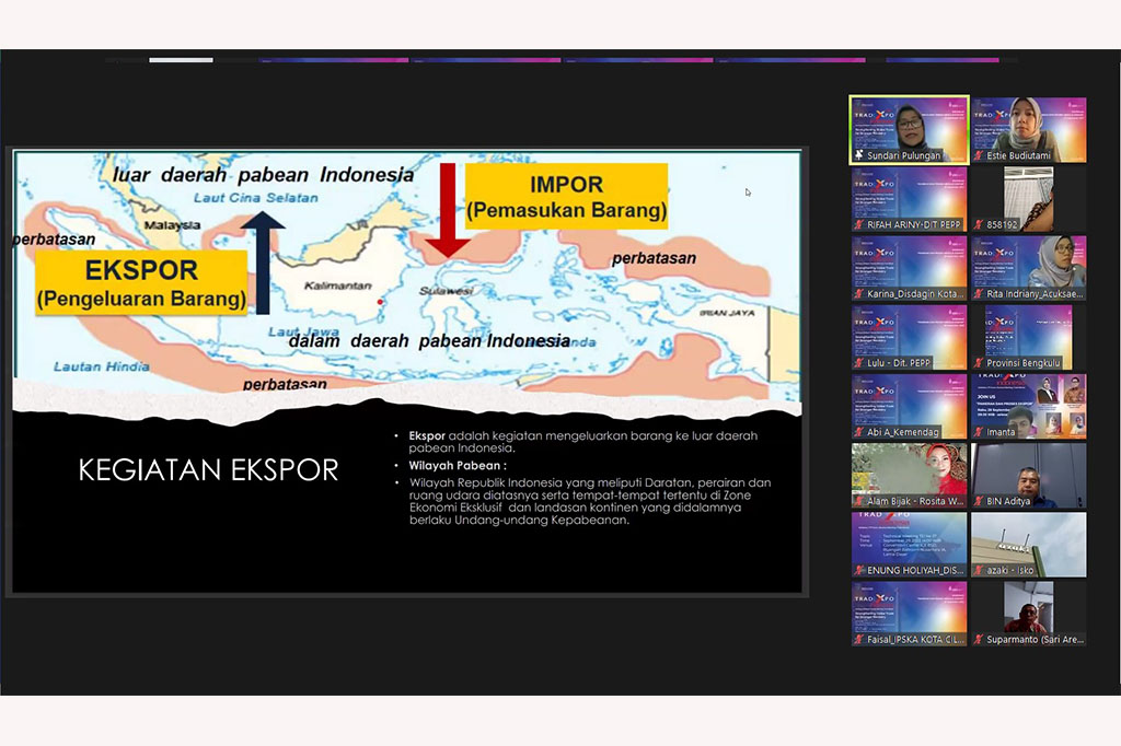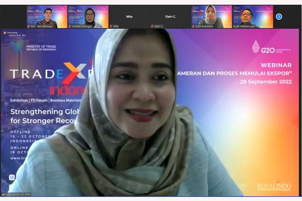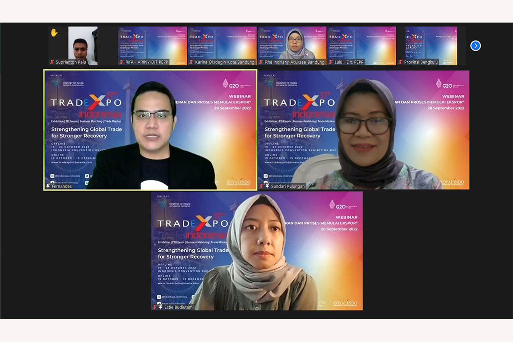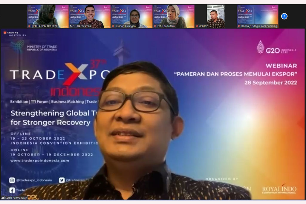 Kementerian Perdagangan menggelar Webinar “Pameran dan Proses Ekspor” bagi perusahaan peserta Trade Expo Indonesia (TEI) ke-37 Tahun 2022, pada Rabu (28 Sep).