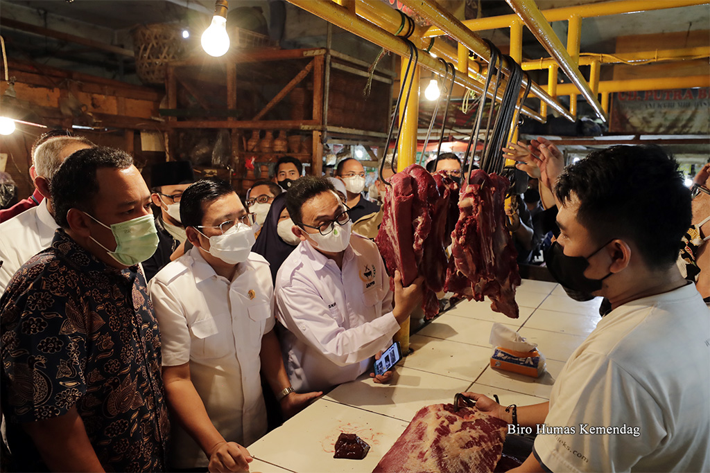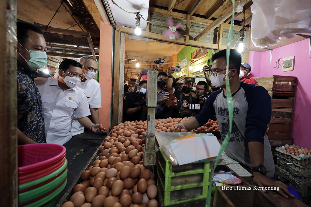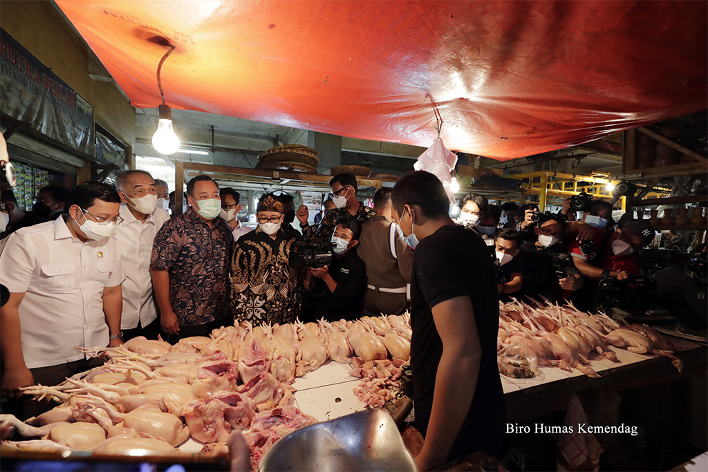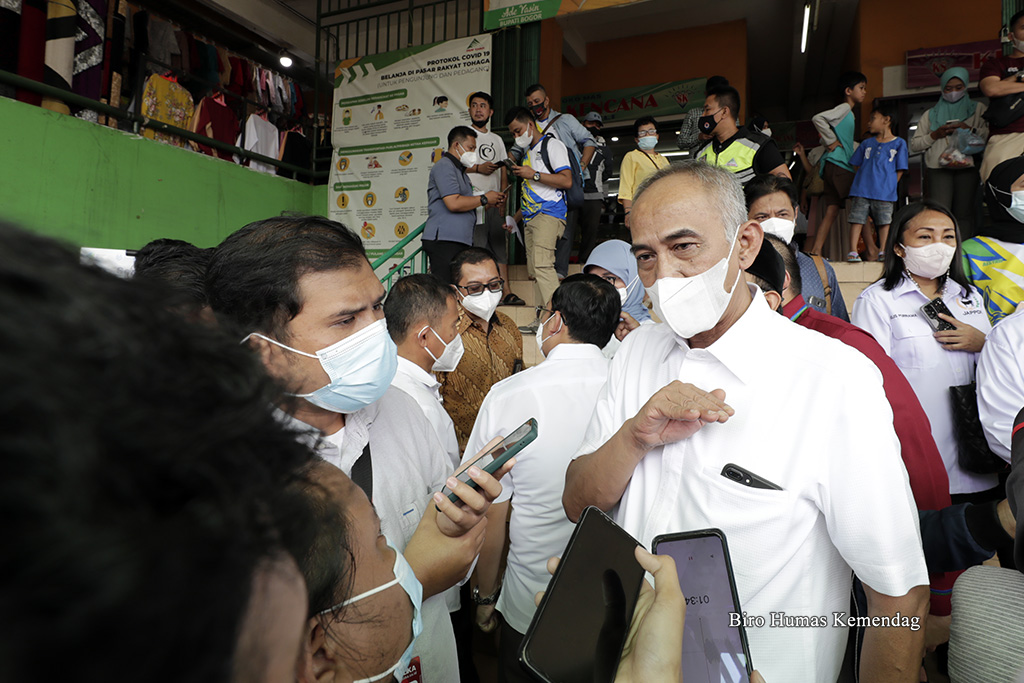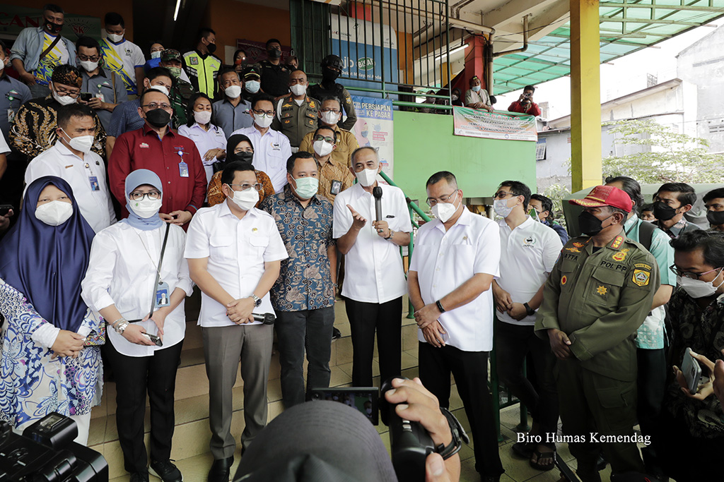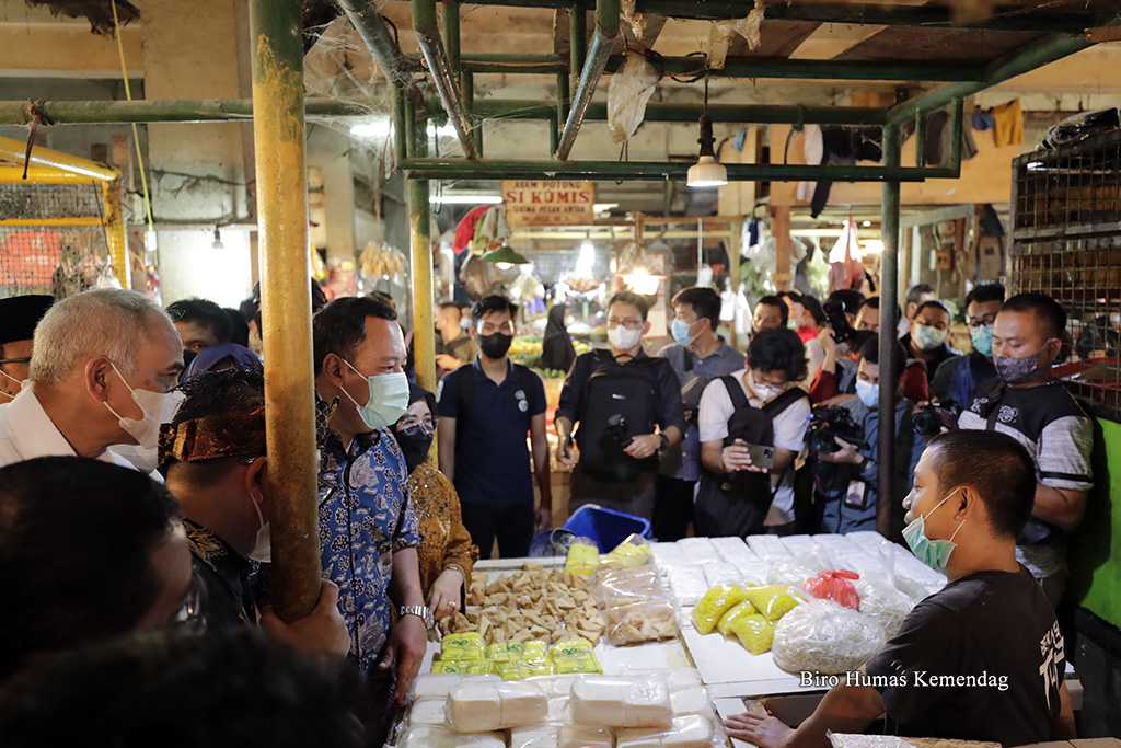 Direktur Jenderal Perdagangan Dalam Negeri, Oke Nurwan mendampingi anggota Komisi VI DPR RI meninjau harga dan stok barang kebutuhan pokok (bapok) di Pasar Cibinong, Bogor, Jawa Barat, Selasa (12 Apr). Peninjauan dilakukan untuk memastikan ketersediaan pasokan bapok selama Ramadan dan menjelang Idulfitri 1443 H.