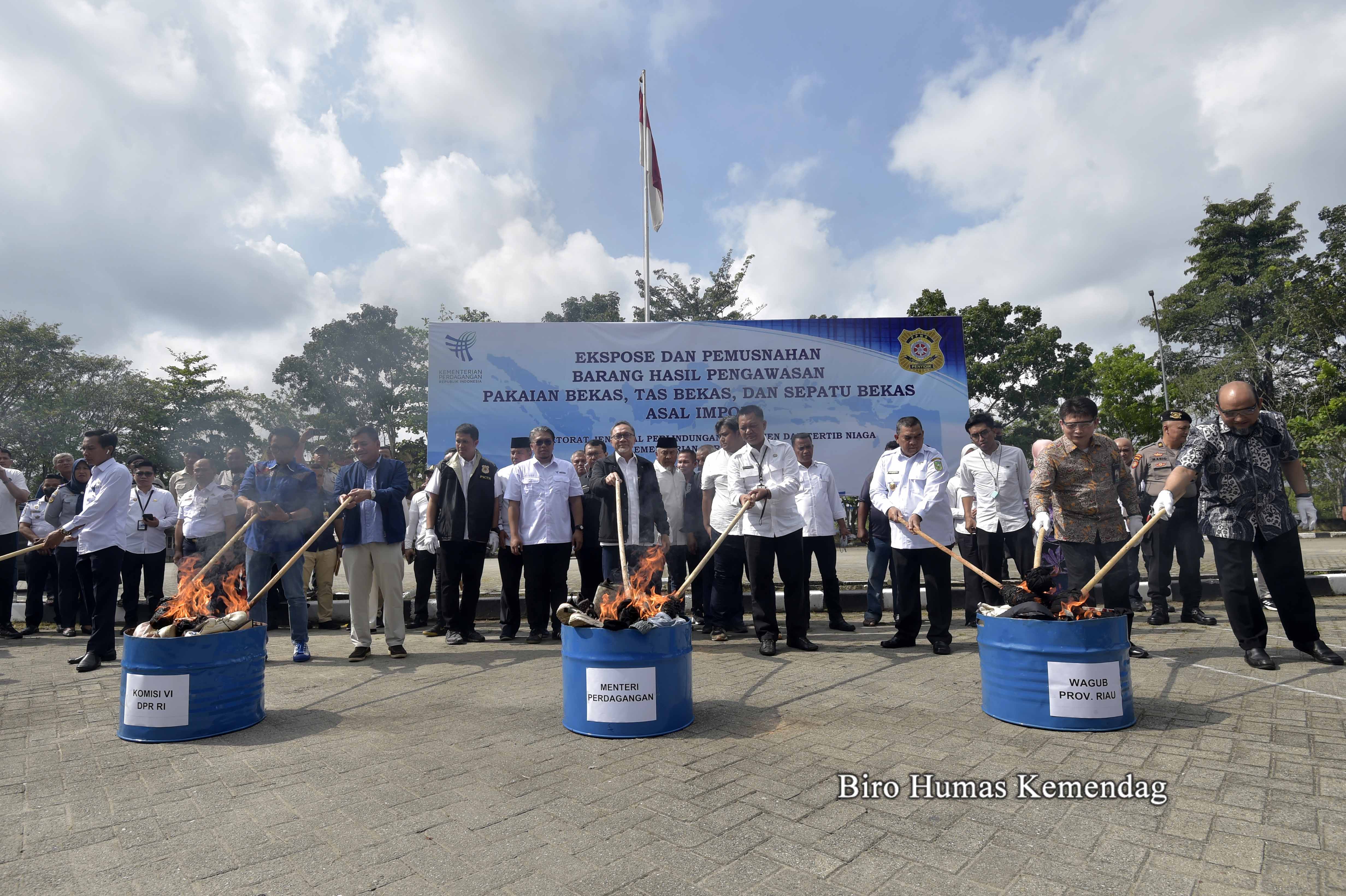Menteri Perdagangan, Zulkifli Hasan bersama Wakil Gubernur Riau, Edy Nasution dan Plt Direktur Jenderal Perlindungan Konsumen dan Tertib Niaga, Moga Simatupang memusnahkan 730 bal pakaian, sepatu, dan tas bekas yang diduga asal impor senilai kurang lebih Rp10 miliar di Pekanbaru, Riau, Jumat (17 Mar).