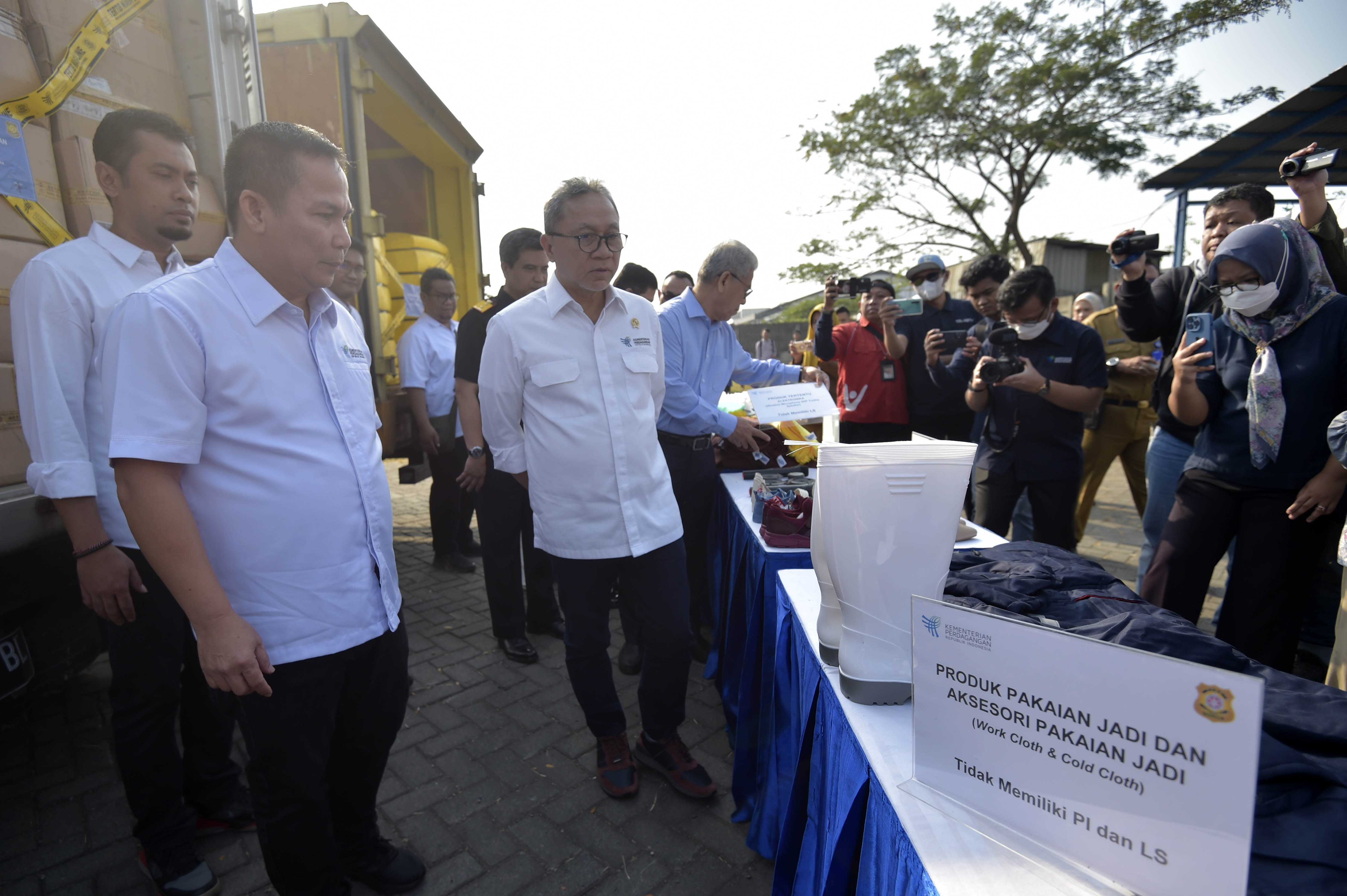 Menteri Perdagangan, Zulkifli Hasan bersama Anggota DPR RI Komisi X, Zainuddin Maliki; Plt Direktur Jenderal Perlindungan Konsumen dan Tertib Niaga, Moga Simatupang; Kepala Kanwil Ditjen Bea Cukai Jawa Timur I, Untung Basuki; Wakil Kepala Kejaksaan Tinggi Jawa Timur, Jehezkiel Devi Sudarso; Kepala Dinas Perindustrian dan Perdagangan Jawa Timur, Iwan; Kasubdit I Indagsi Kepolisian Daerah Jatim, AKBP Oki Ahadian Purwono serta Wakapolsek Waru, AKP Bambang Susilo memusnahkan barang impor tidak sesuai ketentuan senilai Rp12 miliar di Sidoarjo, Jawa Timur, Senin (24 Juli).
