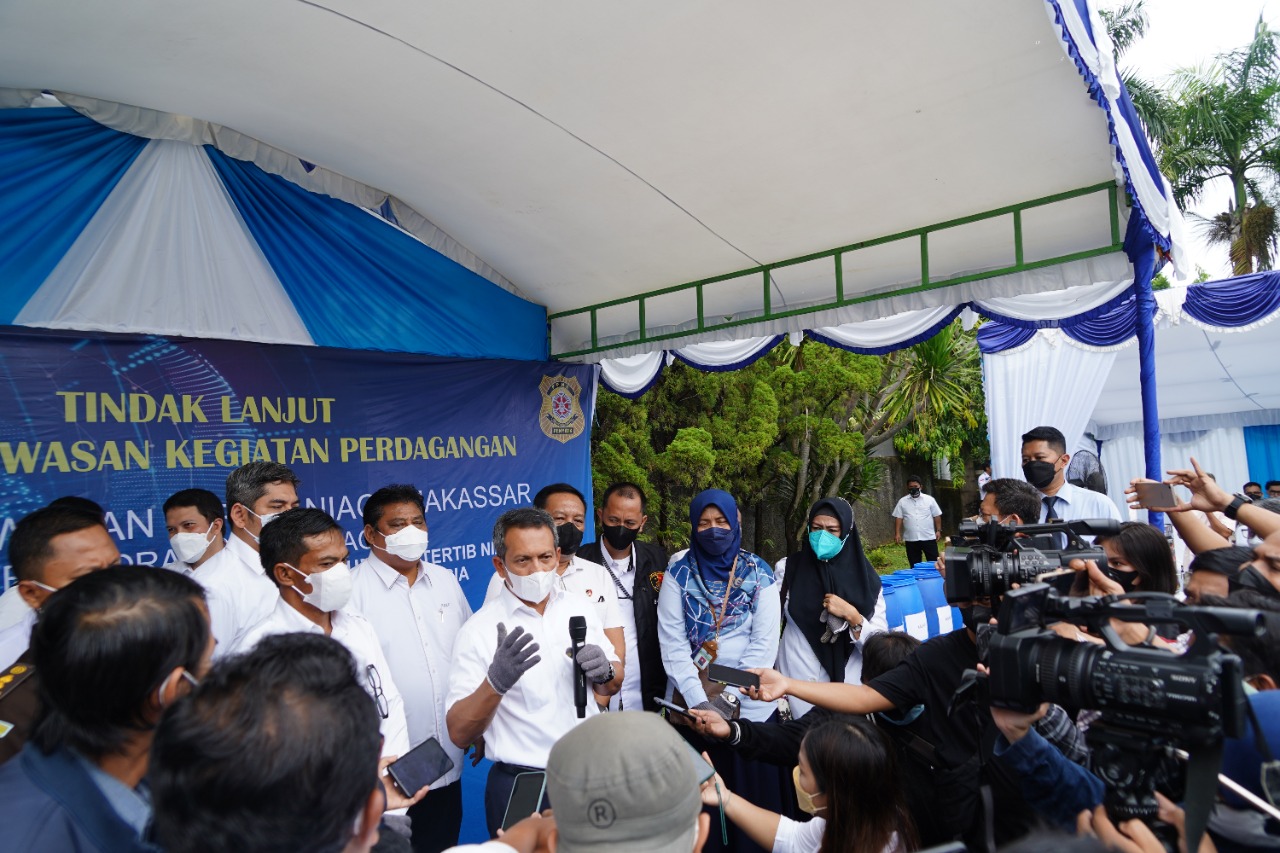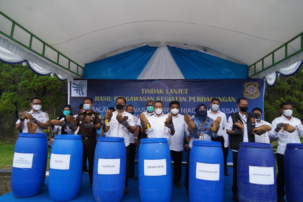 Kementerian Perdagangan menggelar pemusnahan barang yang tidak sesuai ketentuan senilai Rp460.096.800 di Kantor Balai Pengawasan Tertib Niaga (BPTN) Makassar, Sulawesi Selatan, Rabu (30 Mar). Pemusnahan dipimpin Direktur Jenderal Perlindungan Konsumen dan Tertib Niaga Veri Anggrijono.