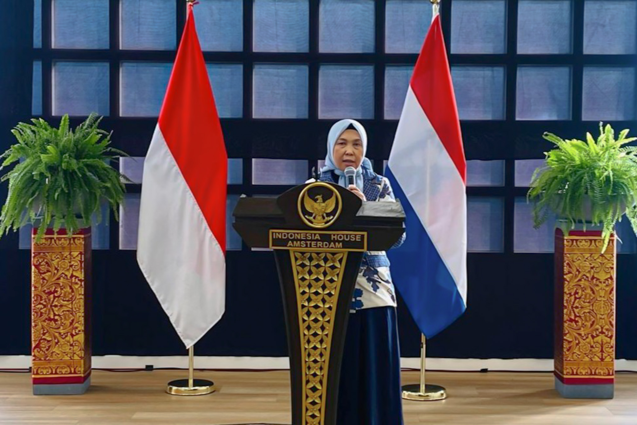 Direktur Jenderal Pengembangan Ekspor Nasional, Fajarini Puntodewi memberikan sambutan kunci pada Forum Bisnis “Where Spices Tell Stories” di Indonesia House of Amsterdam, Belanda, Kamis (30 Okt).