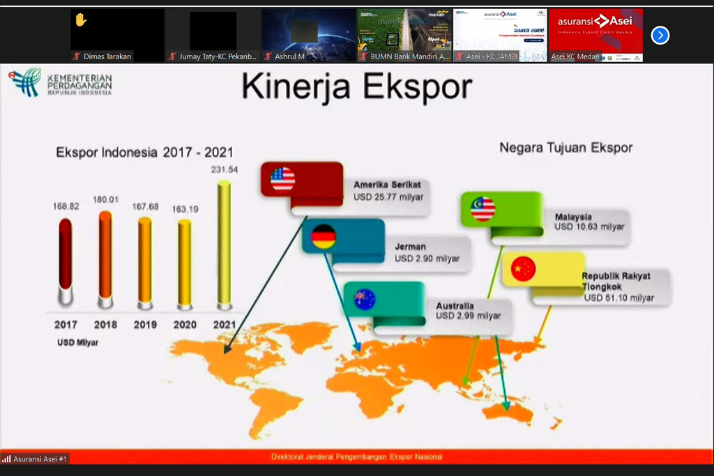 Direktur Kerja Sama Pengembangan Ekspor, Ni Made Ayu Marthini mewakili Direktur Jenderal Pengembangan Ekspor Nasional menjadi pembicara pada Business Gathering PT Asuransi Ekspor Indonesia (ASEI) dengan tema “Sinergi Ekspor Nasional” pada Rabu (26 Jan).