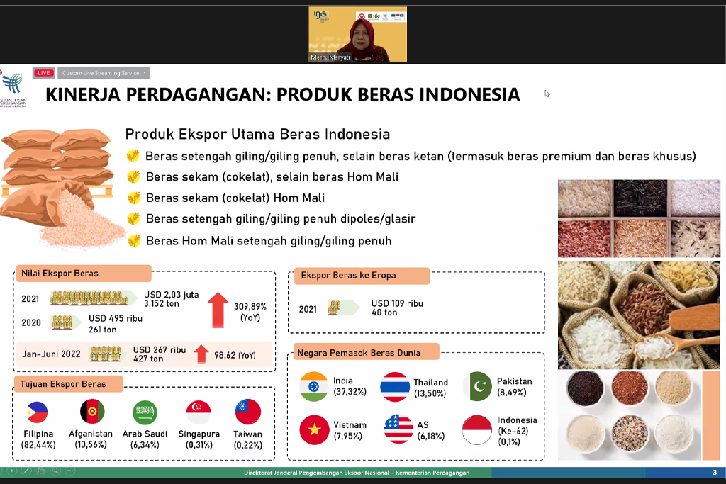 Pada kesempatan ini, Merry memaparkan perkembangan ekspor produk beras Indonesia serta dukungan bagi ekspor produk beras organik premium yang berindikasi geografis Indonesia.