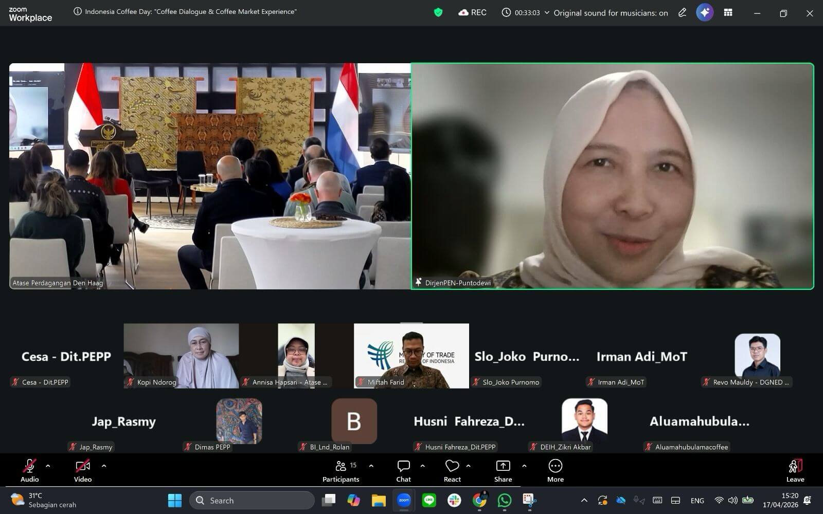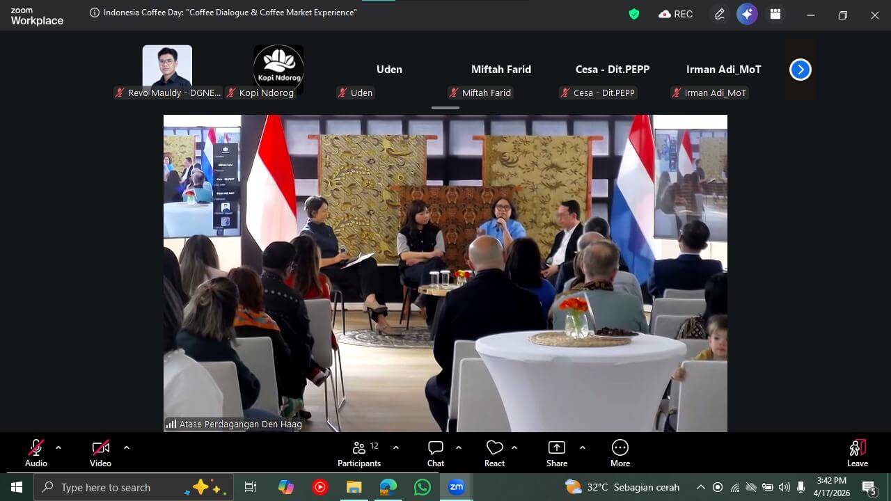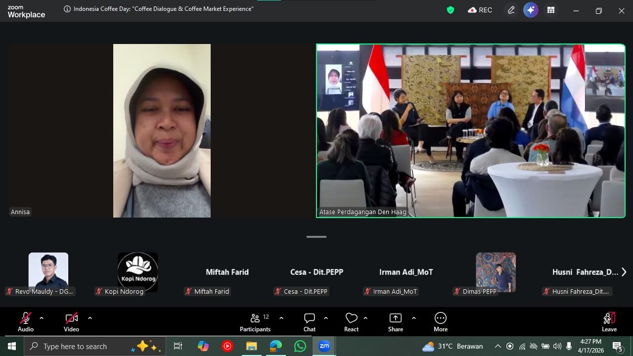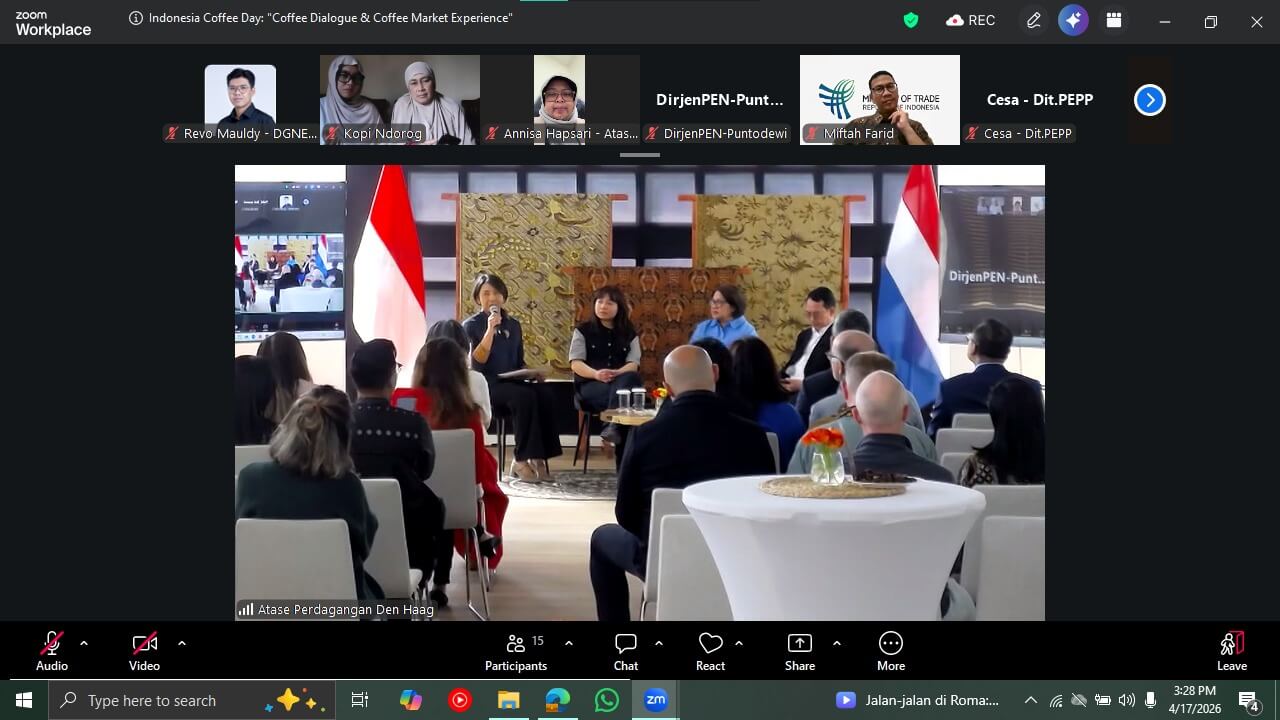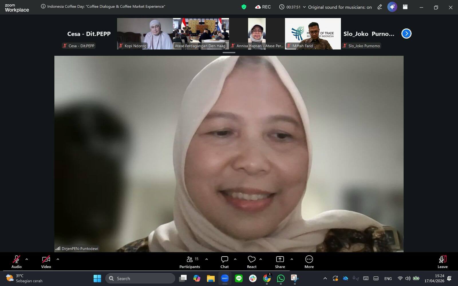 Dirjen Pengembangan Ekspor Nasional, Fajarini Puntodewi memberikan keynote speech pada acara Indonesia Coffee Day bertema “Coffee Dialogue and Coffee Market Experience” yang diselenggarakan di Amsterdam, Belanda, Jumat (17 Apr).