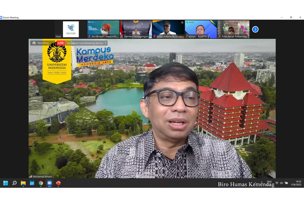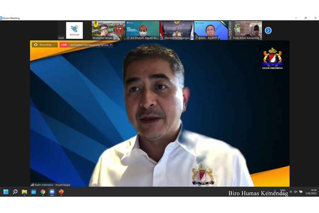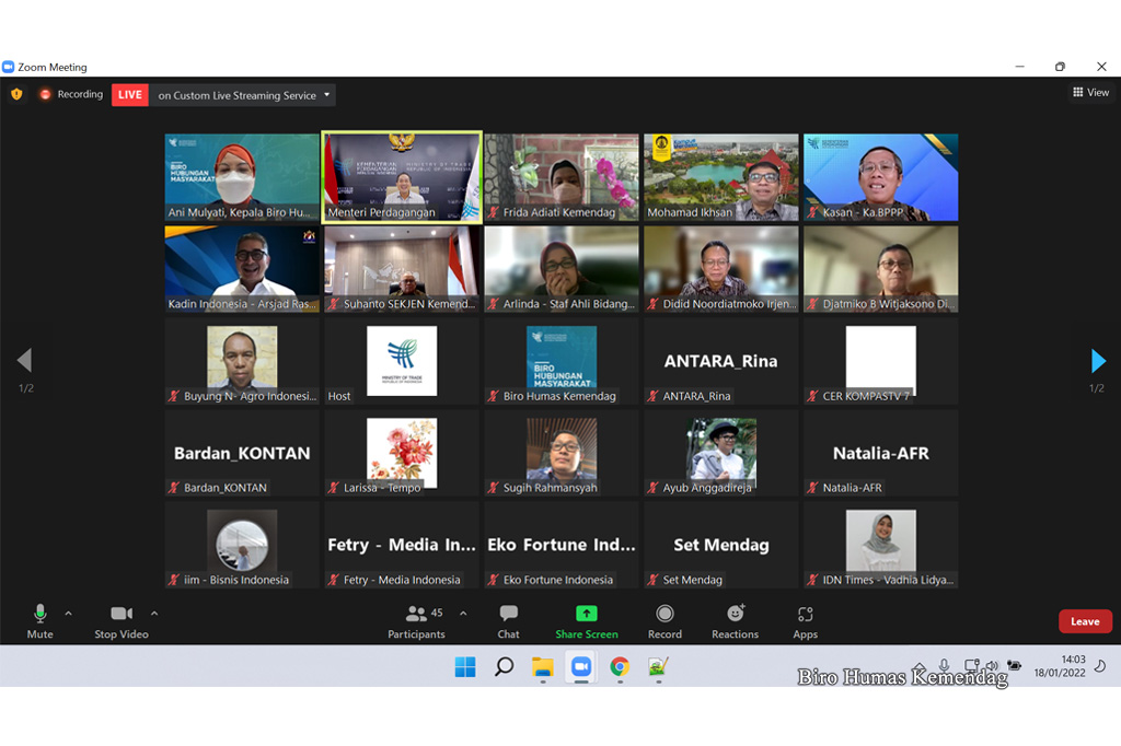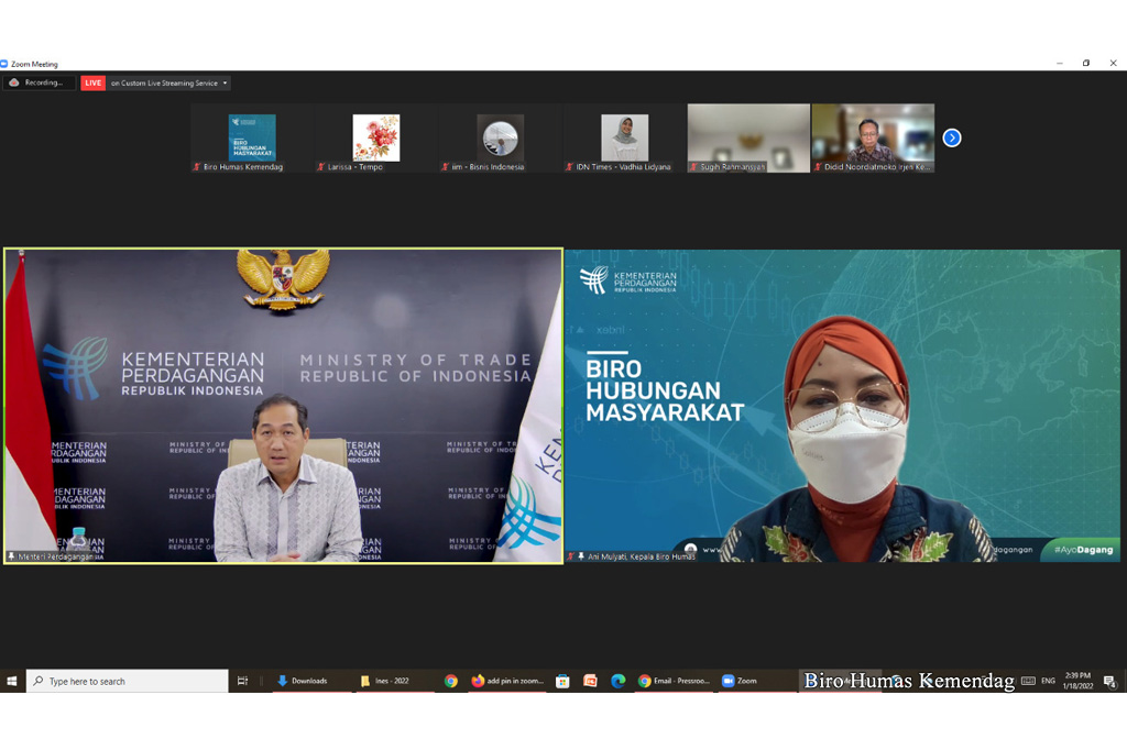 Menteri Perdagangan, Muhammad Lutfi bersama Ketua Umum KADIN Indonesia, Arsjad Rasjid dan Dosen Universitas Indonesia, Mohamad Ikhsan menggelar Konferensi Pers Outlook Perdagangan 2022 secara virtual, Selasa (18 Jan).