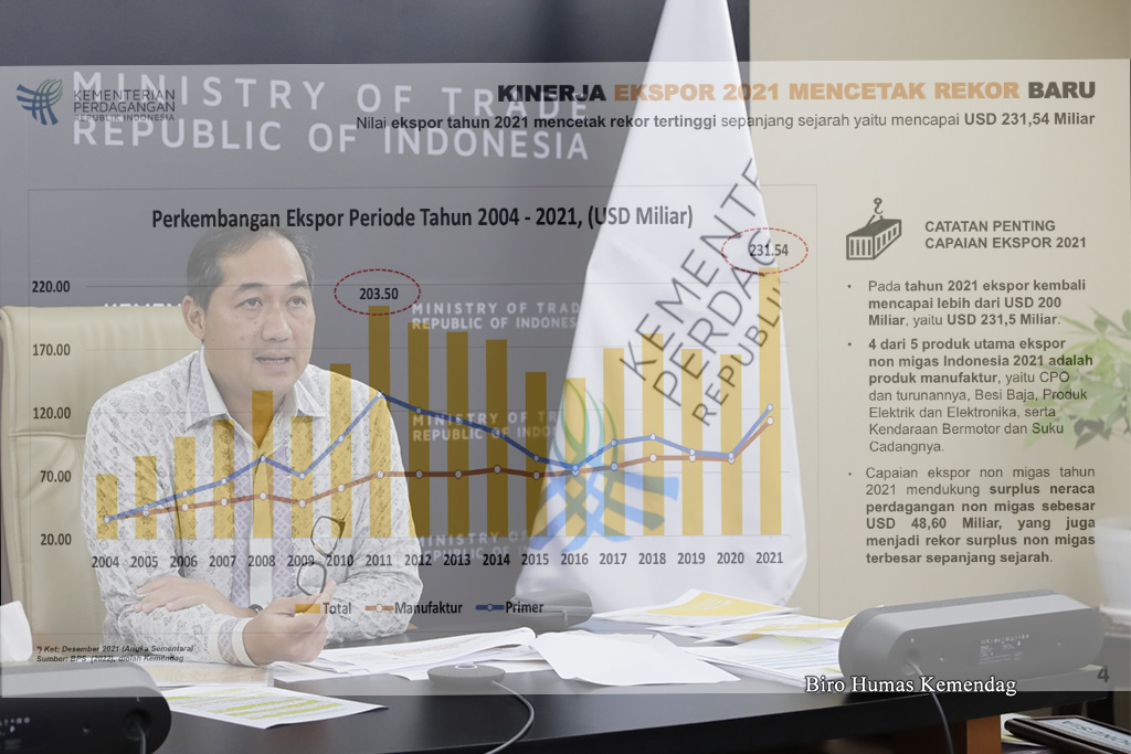 Mendag menyatakan, nilai ekspor Indonesia pada 2021, yang terdiri atas ekspor migas dan nonmigas, memecahkan rekor tertinggi dalam sejarah dengan nilai USD 231,54 miliar. Besaran ini mengalahkan nilai ekspor tertinggi Indonesia yang selama ini dicatatkan pada 2011 sebesar USD 203,50 miliar.