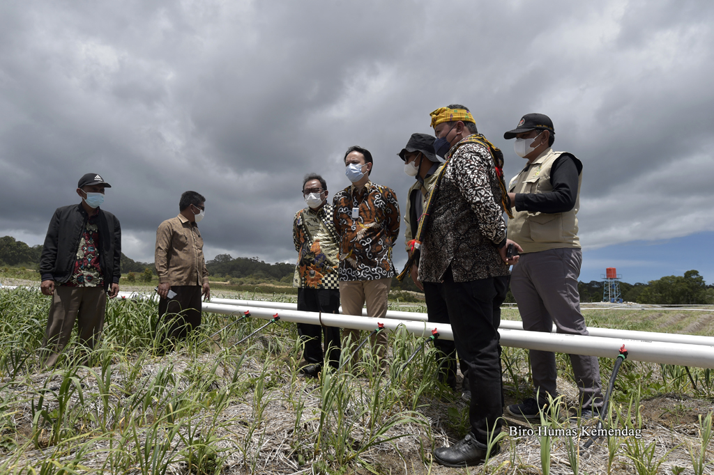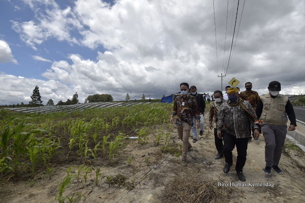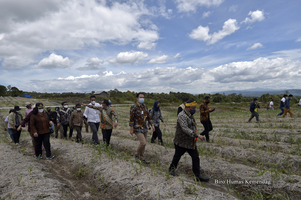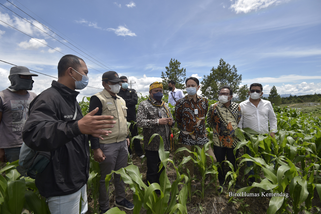 Wakil Menteri Perdagangan, Jerry Sambuaga didampingi Bupati Humbang Hasundutan, Dosmar Banjarnahor; Anggota Komisi VII DPR RI, Lamhot Sinaga serta Direktur Sarana Distribusi dan Logistik Kemendag, Iqbal Shoffan Shofwan meninjau lahan Kawasan Sentra Produksi Pangan (KSPP) berbasis hortikultura di Desa Ria-ria, Kabupaten Humbang Hasundutan, Sumatra Utara, Sabtu (16 Okt).