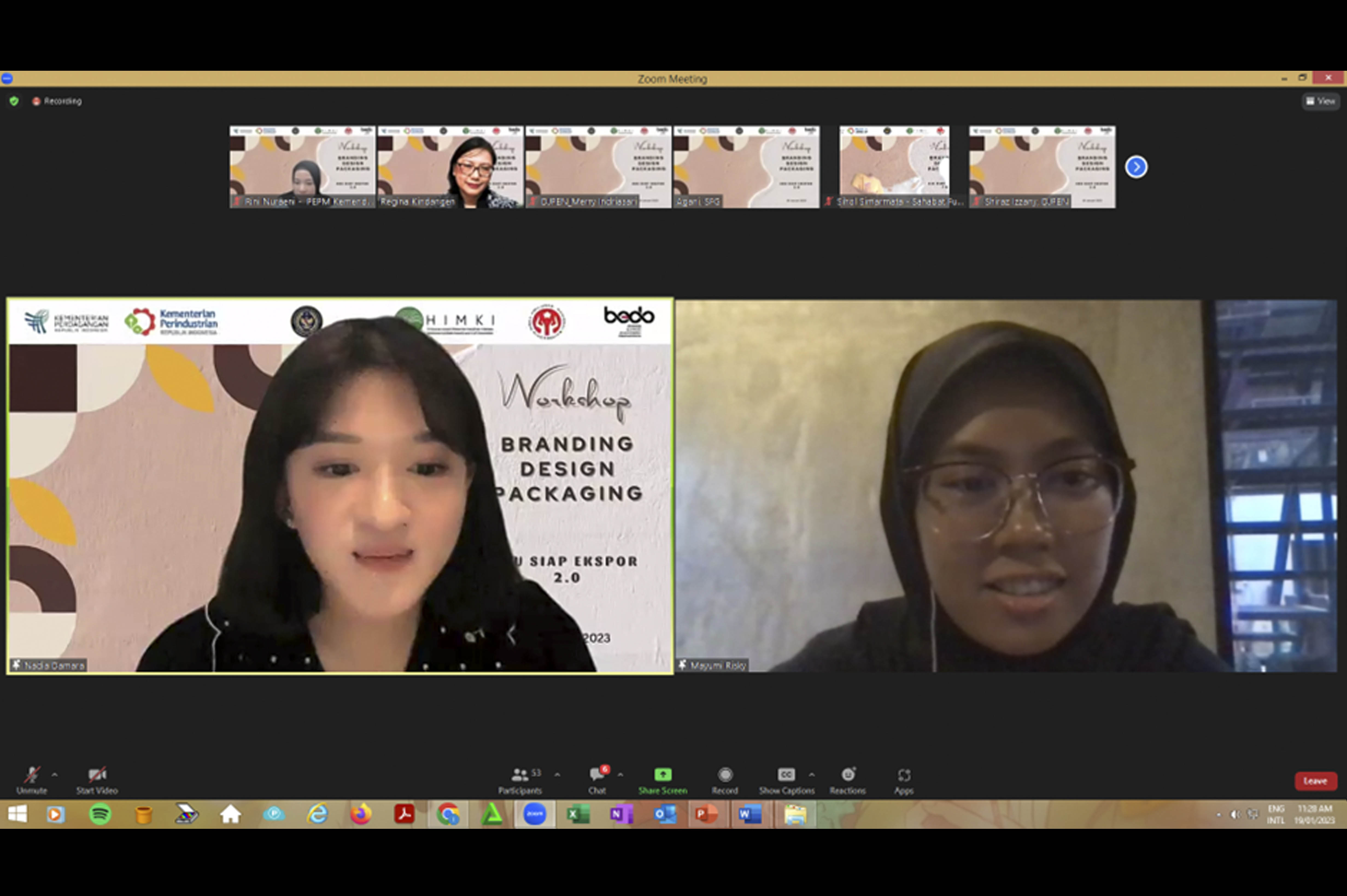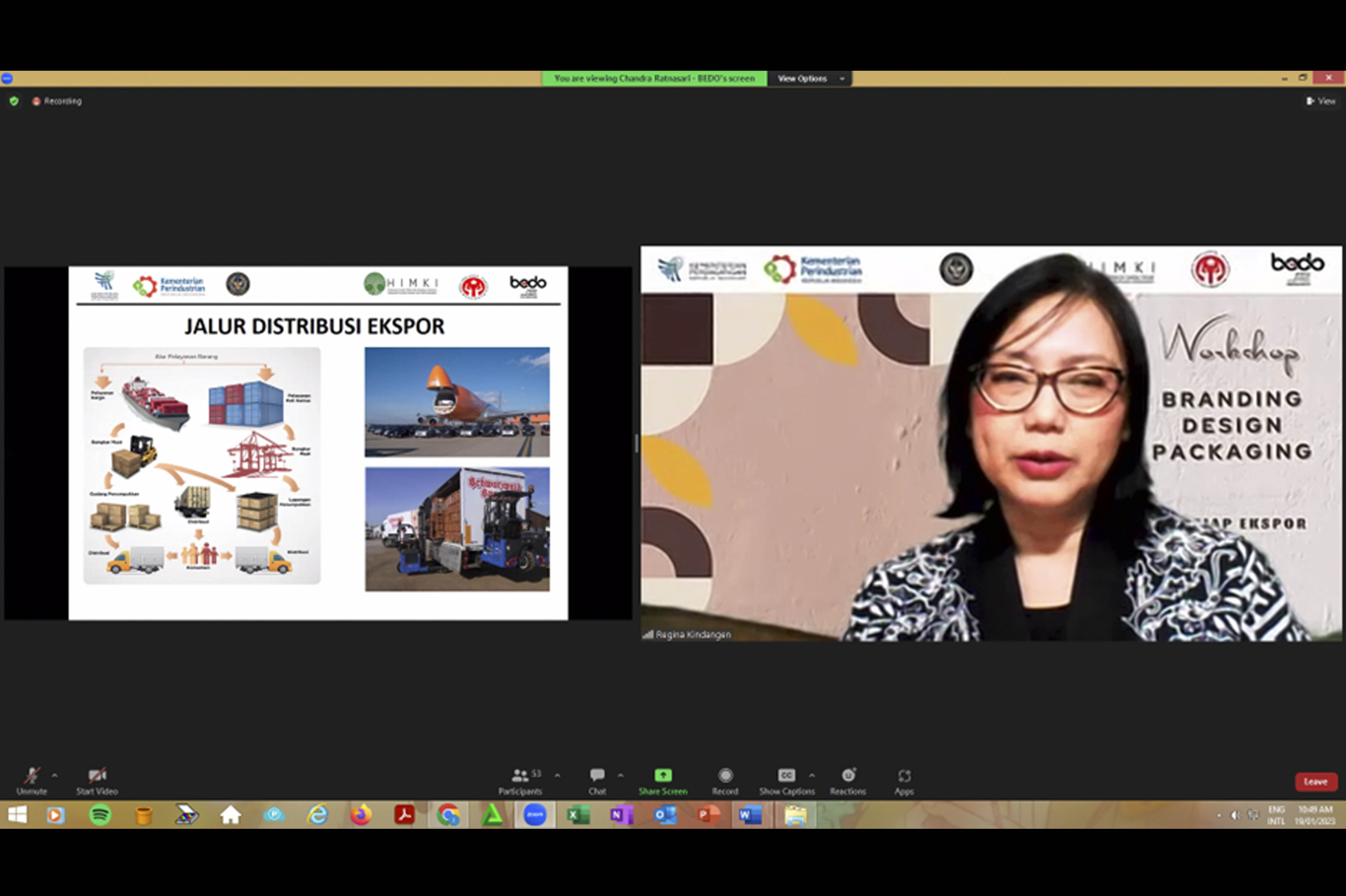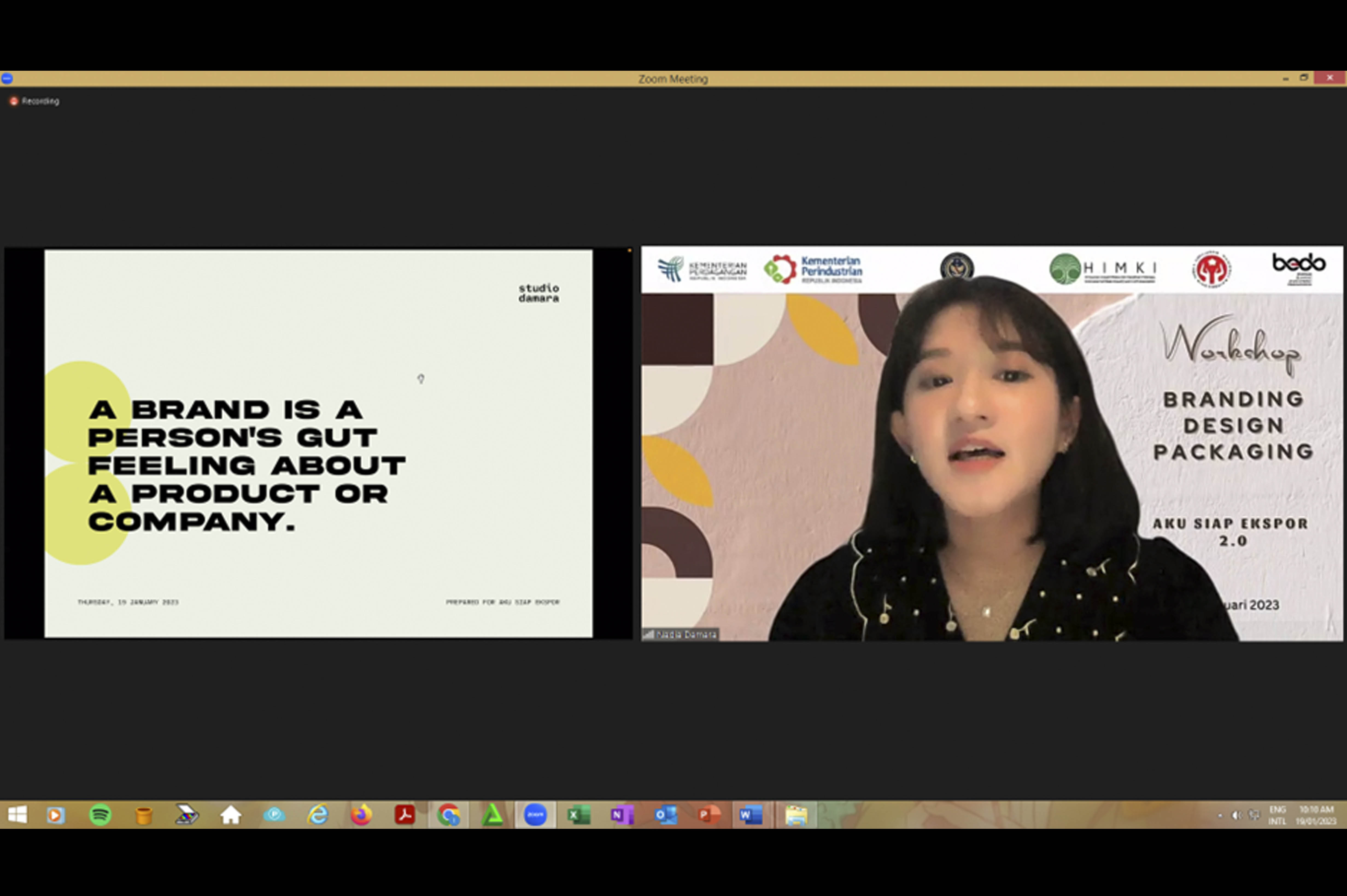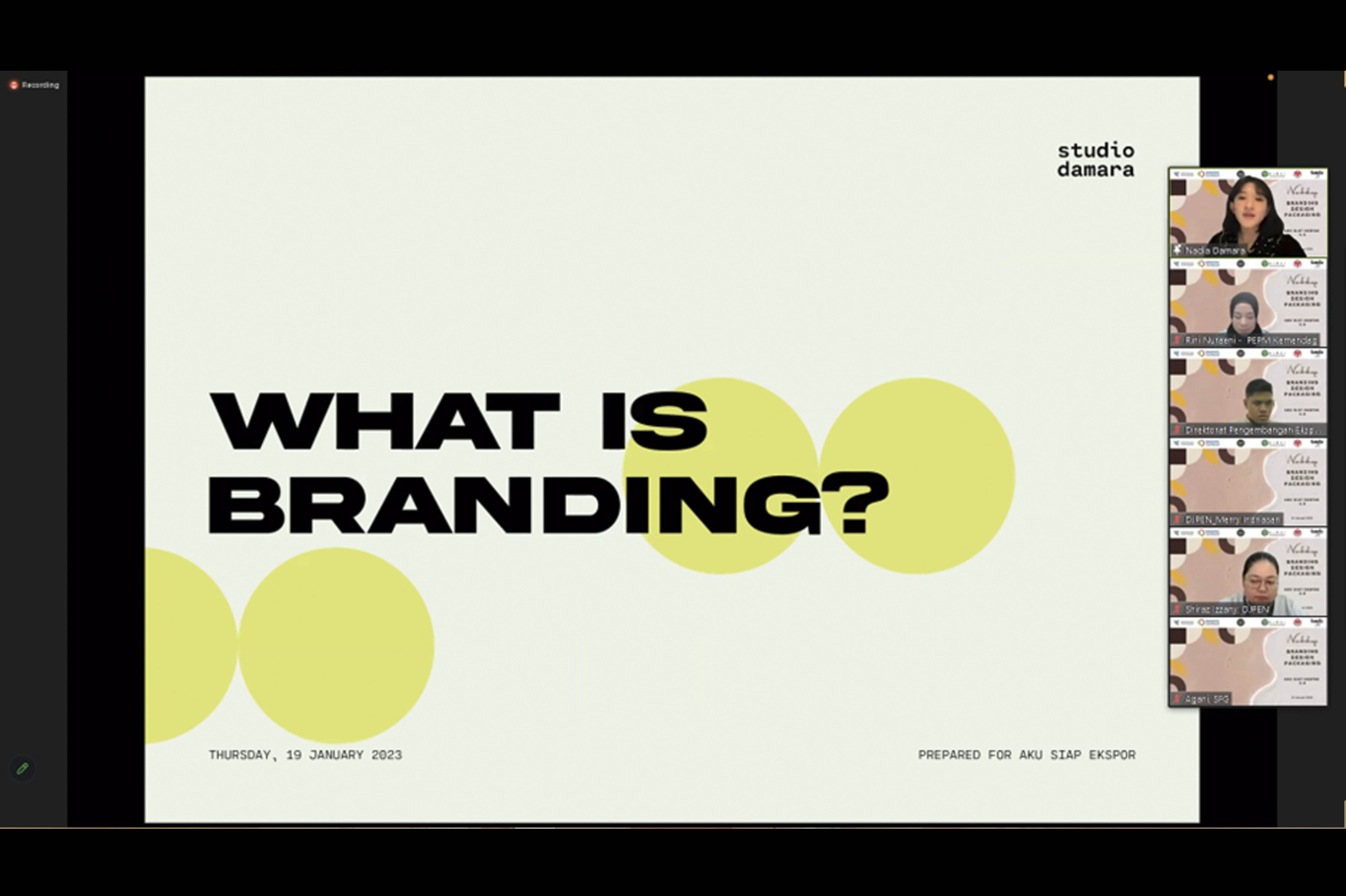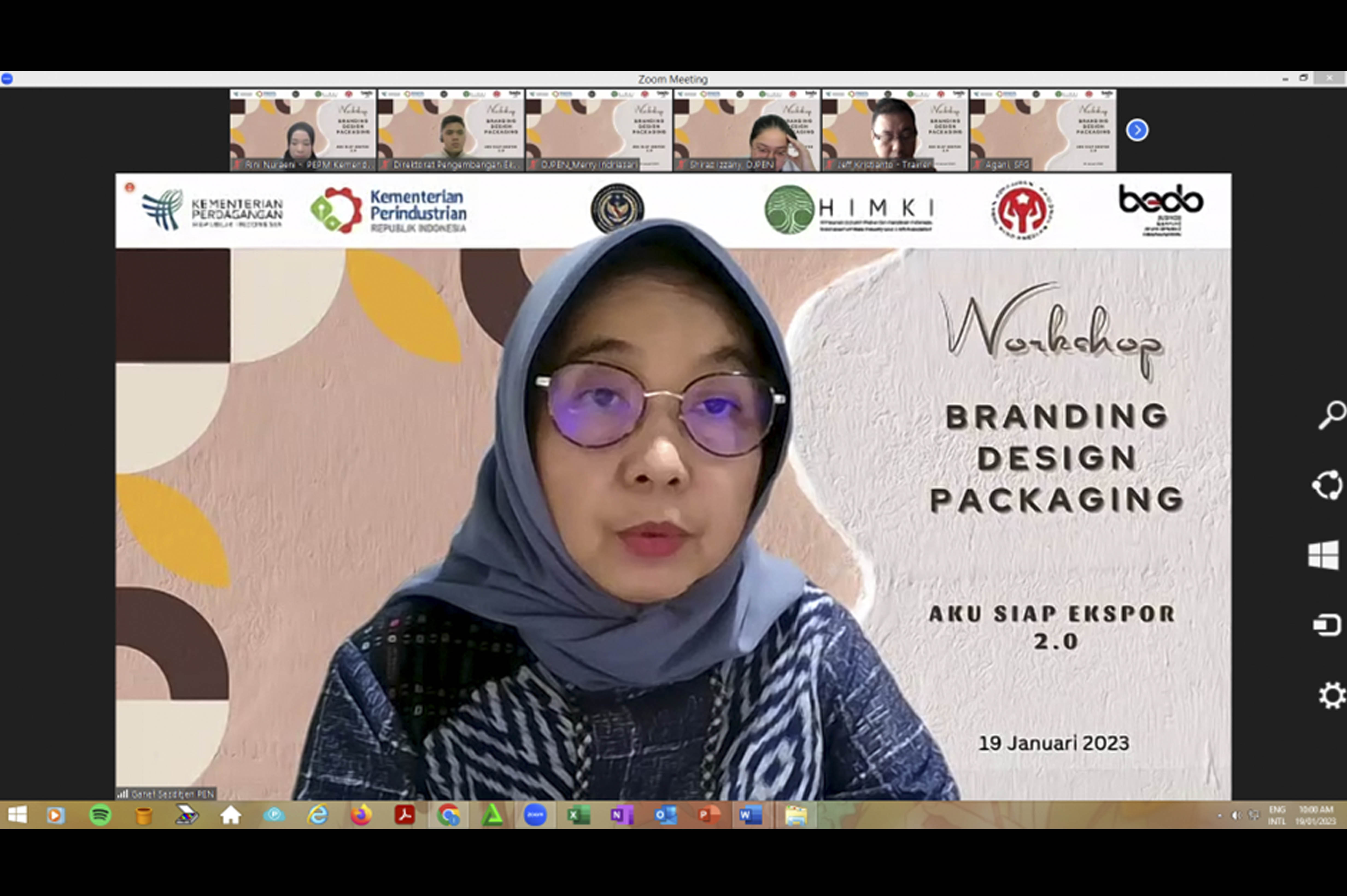 Sekretaris Direktorat Jenderal Pengembangan Ekspor Nasional, Ganef Judawati membuka Lokakarya Daring Branding, Design dan Packaging untuk Ekspor di Jakarta, pada Kamis (19 Jan). Kegiatan yang diikuti 45 peserta ini bertujuan untuk meningkatkan kapasitas peserta program Aku Siap Ekspor (ASE) 2.0.