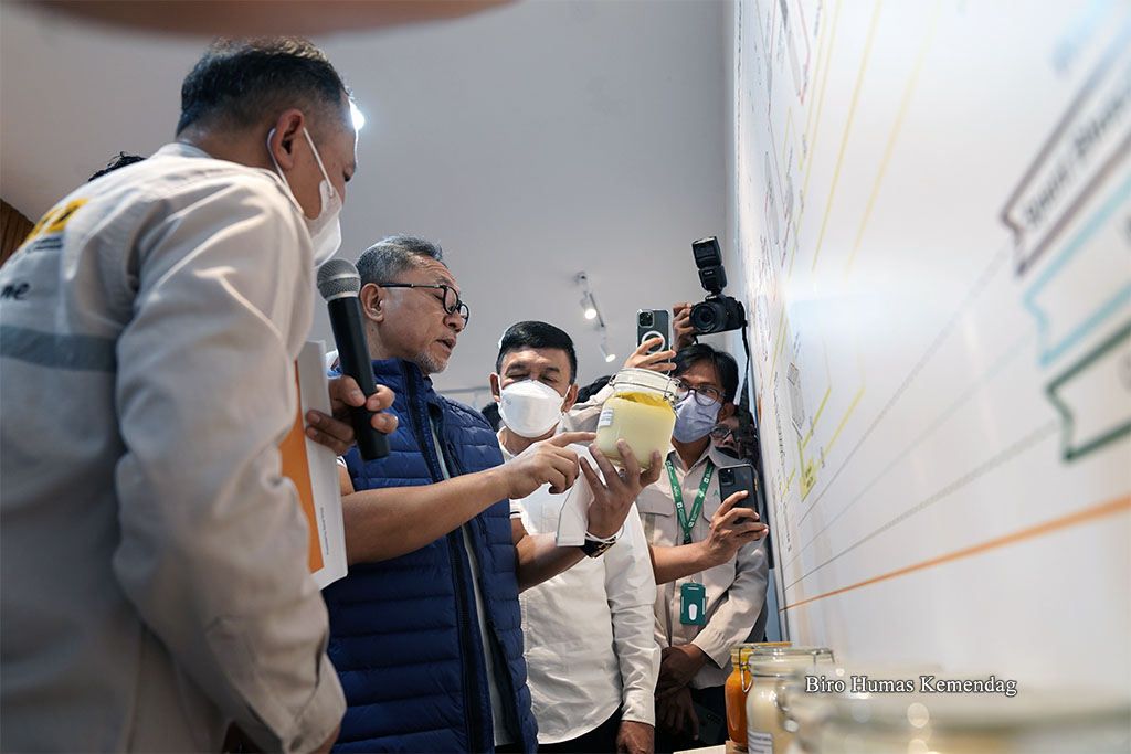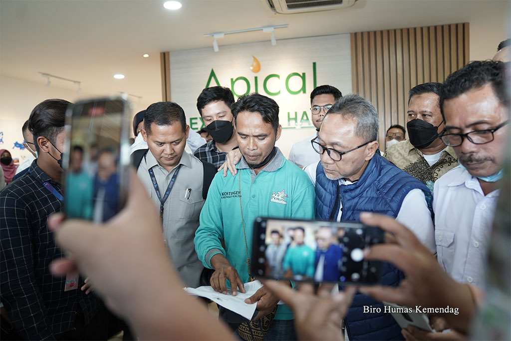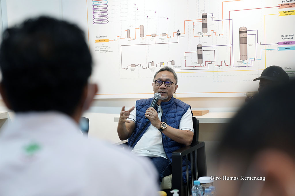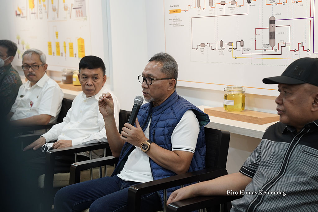 Menteri Perdagangan, Zulkifli Hasan berdiskusi dengan perwakilan Asosiasi Petani Kelapa Sawit Indonesia (Apkasindo) Kalimantan Timur, di PT Kutai Refienery Nusantara di Balikpapan, Kalimantan Timur, Rabu (20 Juli).