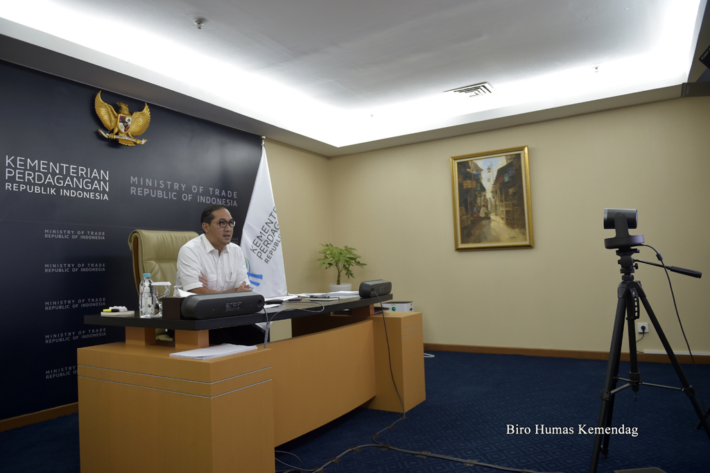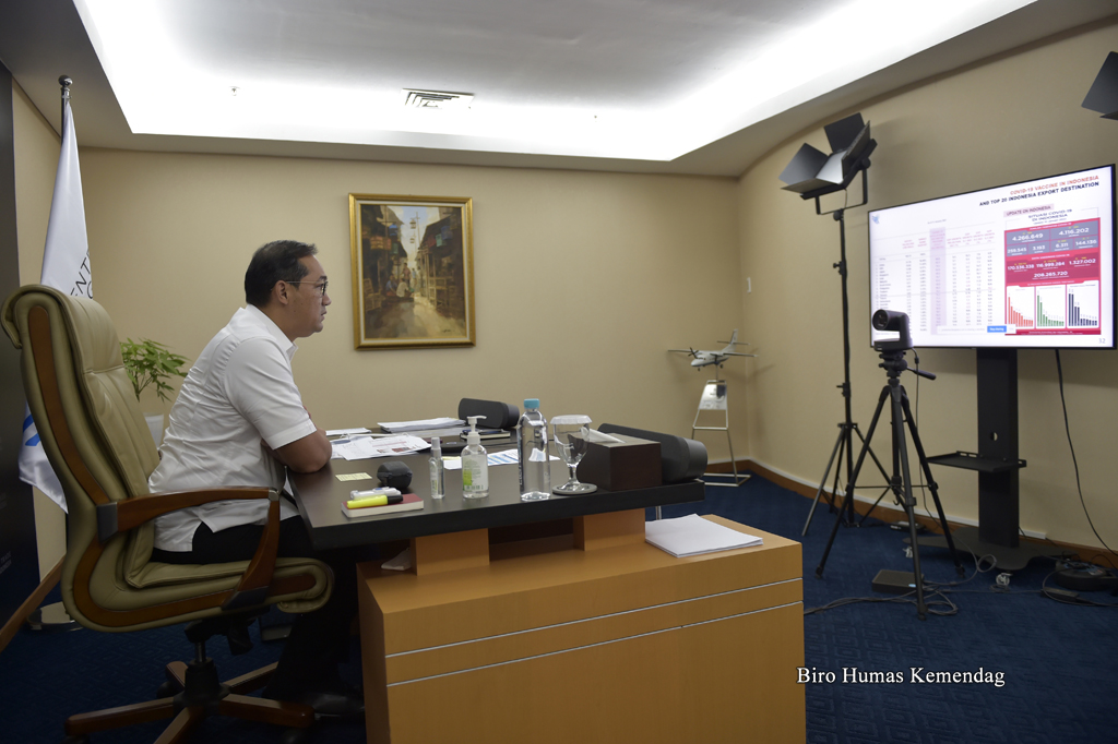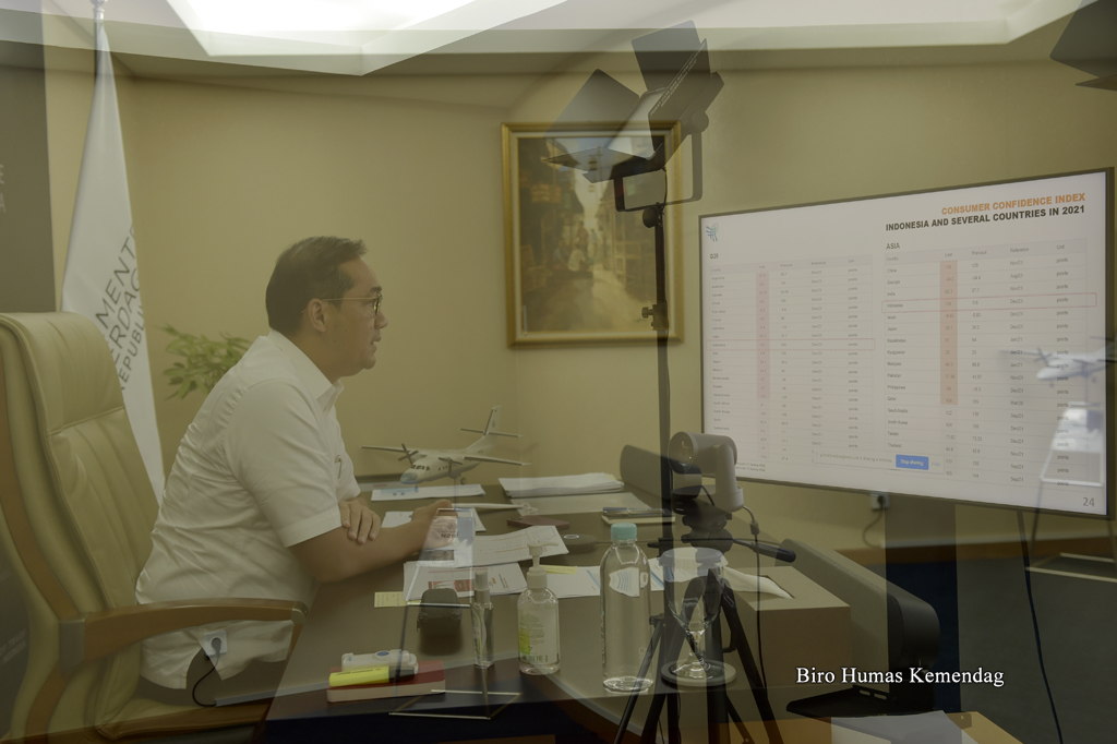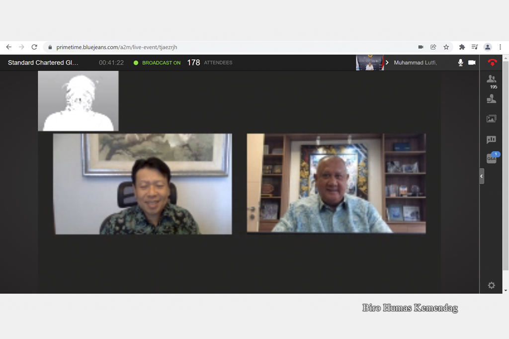 Menteri Perdagangan, Muhammad Lutfi menjadi narasumber dalam acara Mendag Dalam Standard Chartered’s Global Research Briefing H1 2022 yang berlangsung secara virtual di Jakarta, Rabu (12 Jan).