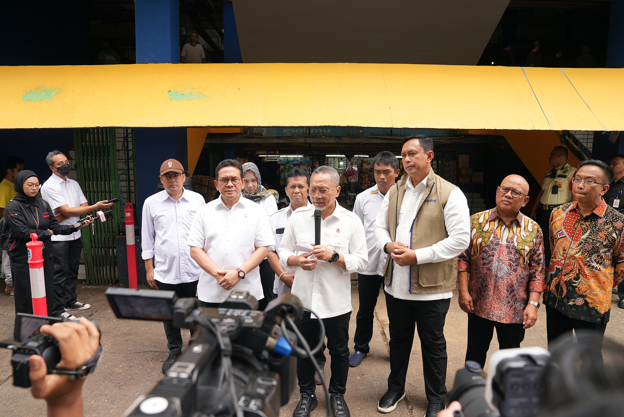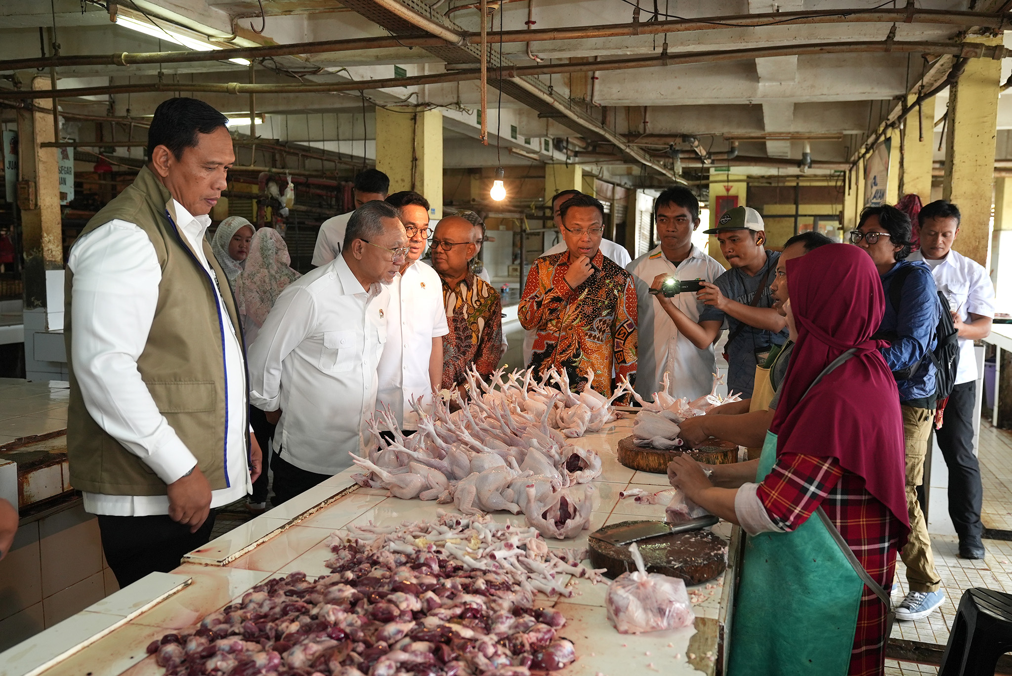 Menteri Perdaganagan, Budi Santoso mendampingi Menteri Koordinator bidang Pangan, Zulkifli Hasan meninjau harga dan ketersediaan Barang Kebutuhan Pokok (Bapok) menjelang tahun baru 2026 di Pasar Kramat Jati, Jakarta, Senin (29 Des).