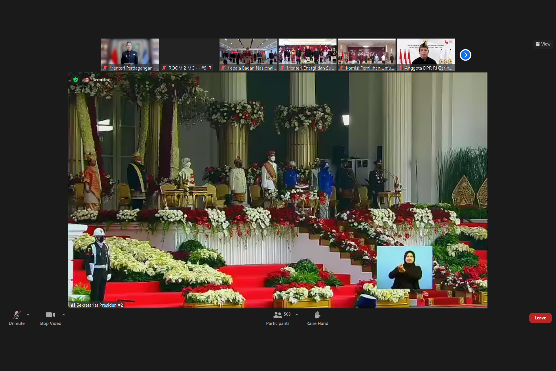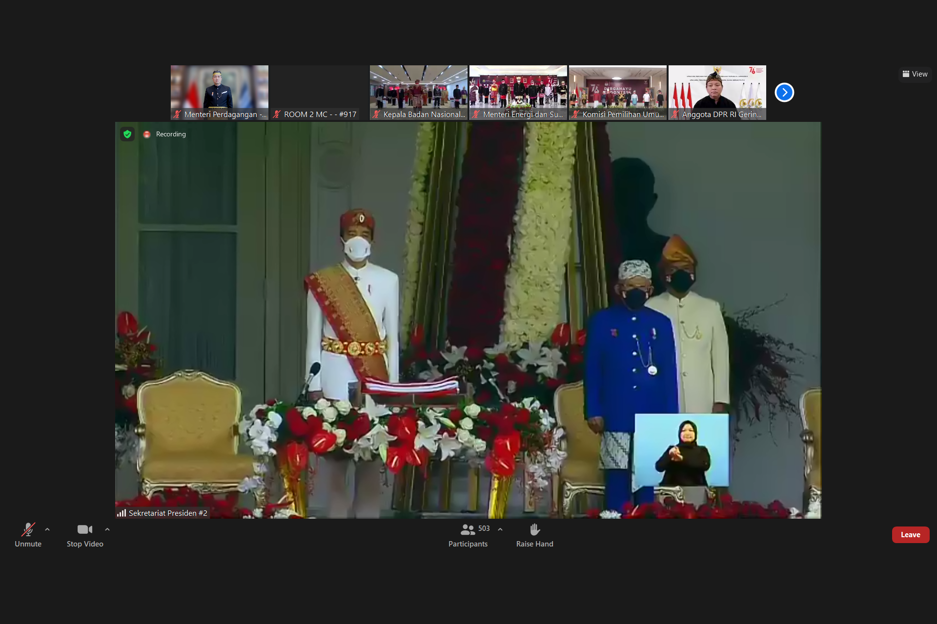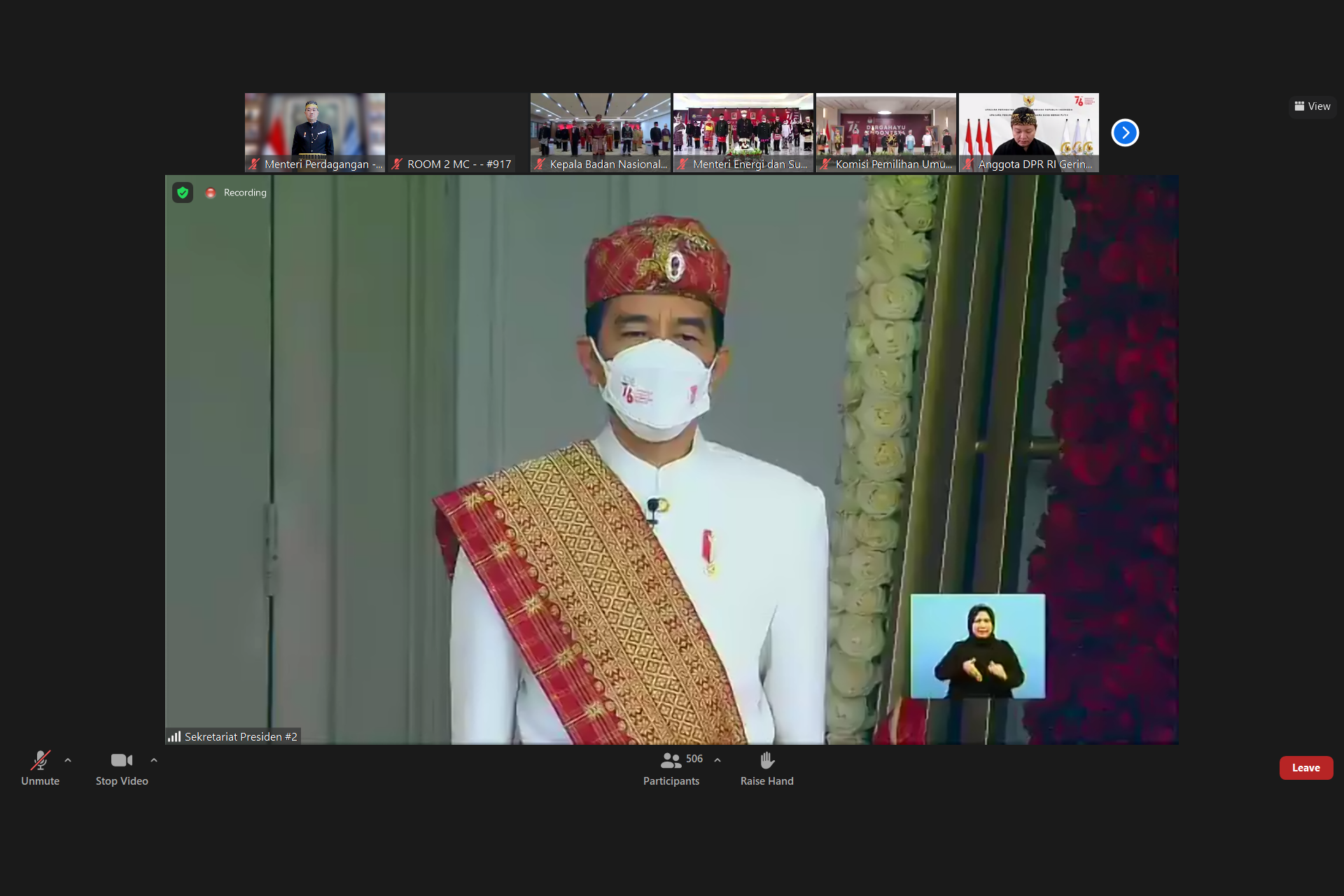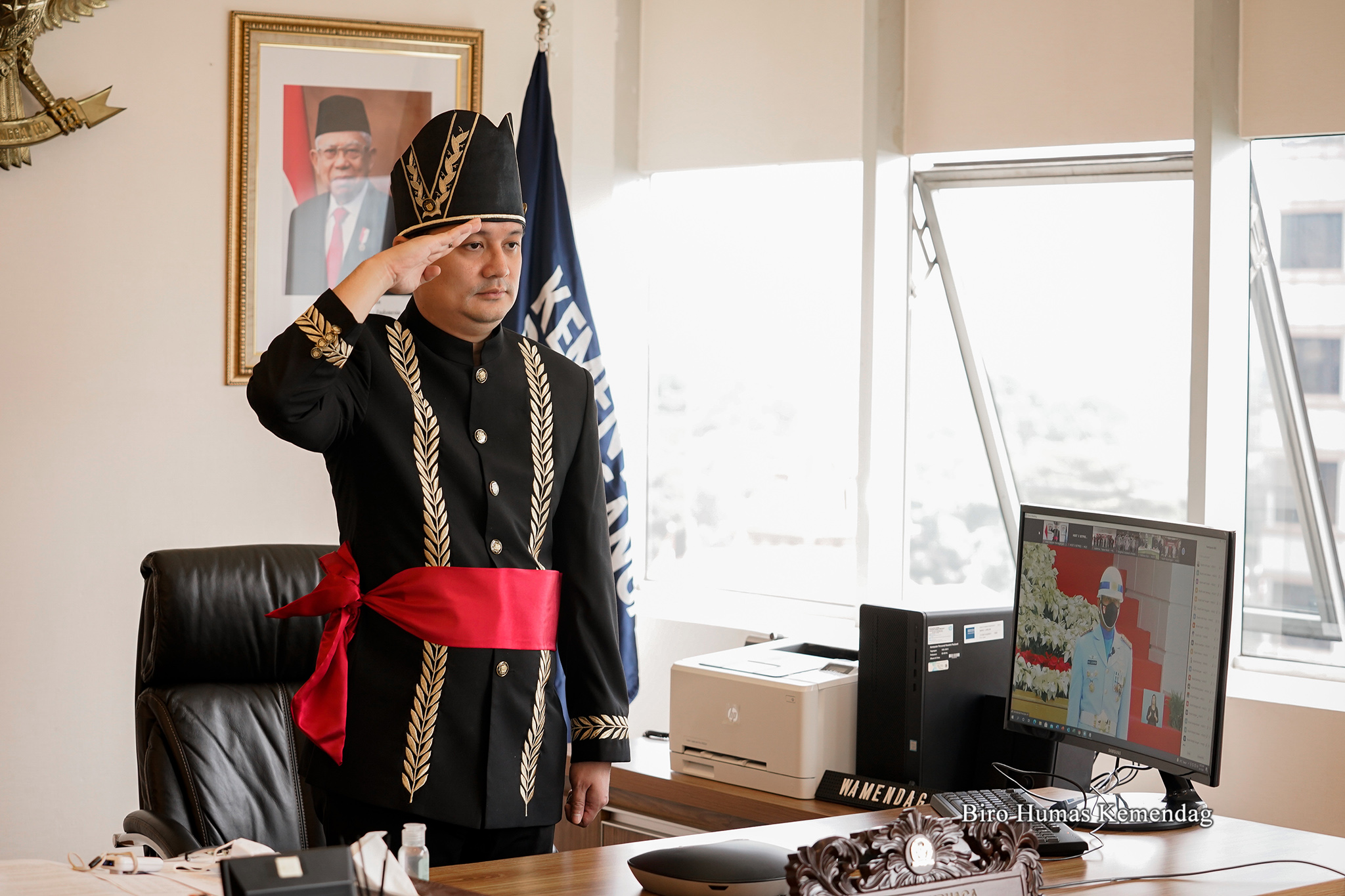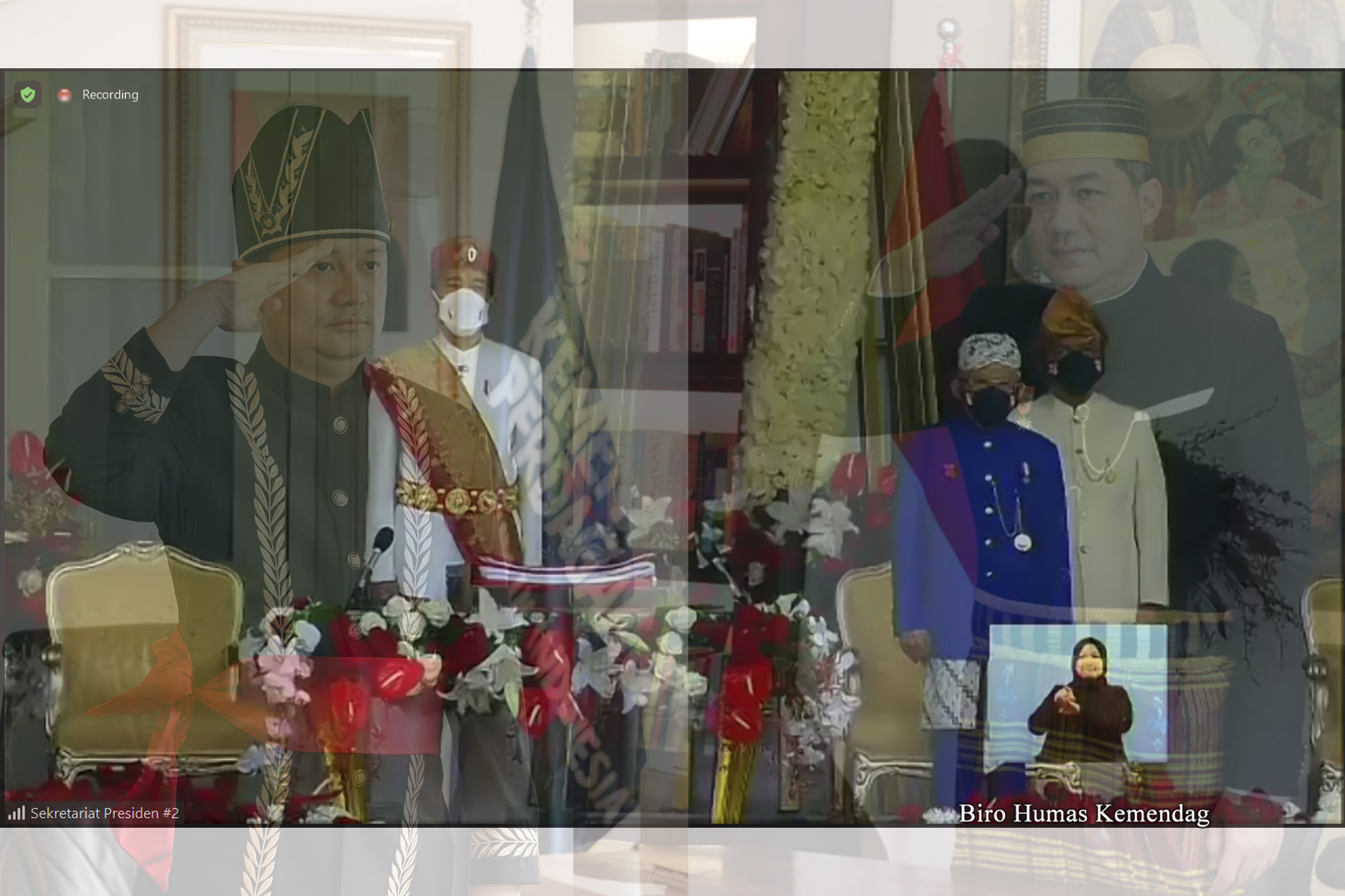 Menteri Perdagangan, Muhammad Lutfi dan Wakil Menteri Perdagangan, Jerry Sambuaga menghadiri Upacara Peringatan Detik-Detik Proklamasi Kemerdekaan RI ke-76 secara virtual yang disiarkan secara langsung dari Istana Merdeka, Jakarta, Selasa (17 Agustus).