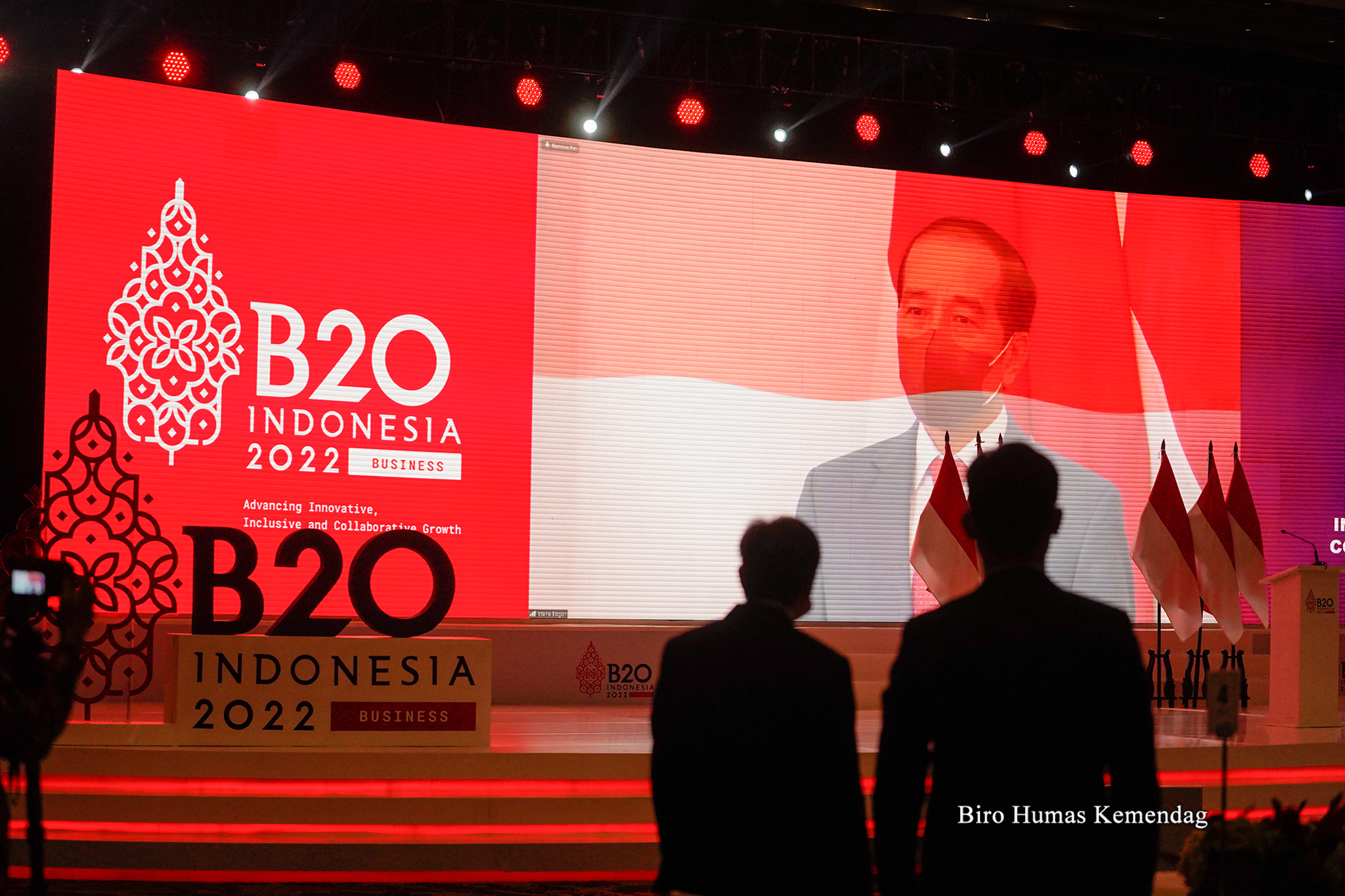 Menteri Perdagangan, Muhammad Lutfi menghadiri B20 Inception Meeting 2022 di Hotel Fairmont, Jakarta, Kamis (27 Jan). Pertemuan tersebut turut dihadiri oleh Presiden Joko Widodo bersama Menteri Sekretaris Kabinet, Pramono Anung; Menteri Investasi/Kepala BKPM, Bahlil Lahadalia; dan Ketua Umum Kadin Indonesia, Arsjad Rasjid secara virtual dari Istana Kepresidenan Bogor.