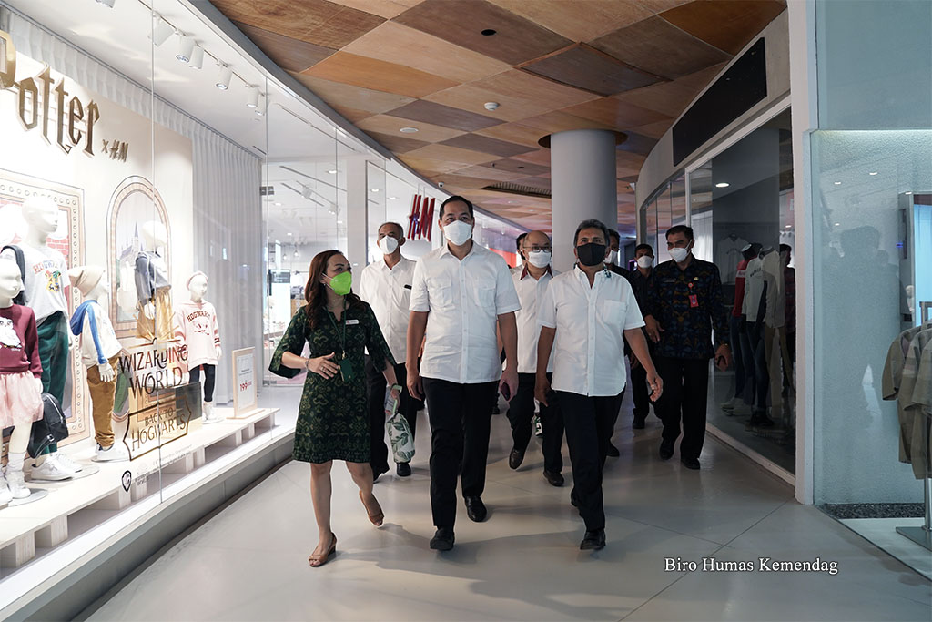 Menteri Perdagangan, Muhammad Lutfi didampingi Wakil Gubernur Bali, Tjokorda Oka Artha Ardhana; Bupati Badung, I Nyoman Giri Prasta; dan Direktur Jenderal Perdagangan Dalam Negeri, Oke Nurwan mengunjungi ritel modern Tiara Dewata dan Beachwalk Shopping Center di Denpasar dan Badung, Bali, Sabtu (25 Sep). Kunjungan ini dilakukan untuk memantau implementasi aplikasi PeduliLindungi di pusat perbelanjaan/mal di Provinsi Bali.