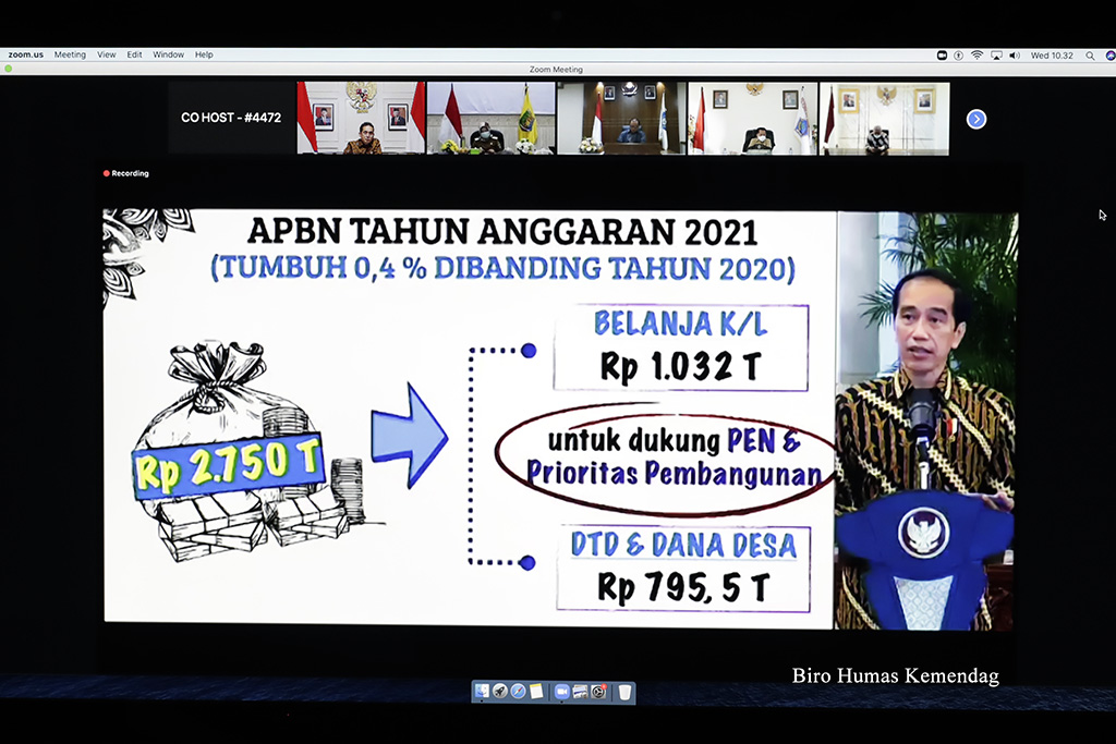 Presiden RI juga menyampaikan bahwa Anggaran Pendapatan dan Belanja Negara merupakan penggerak utama saat ekonomi lesu. Presiden RI mengimbau kepada seluruh pimpinan kementerian atau lembaga untuk segera memanfaatkan dan membelanjakan anggarannya sejak dini agar pada kuartal satu tahun 2021, ekonomi Indonesia mulai bergerak.