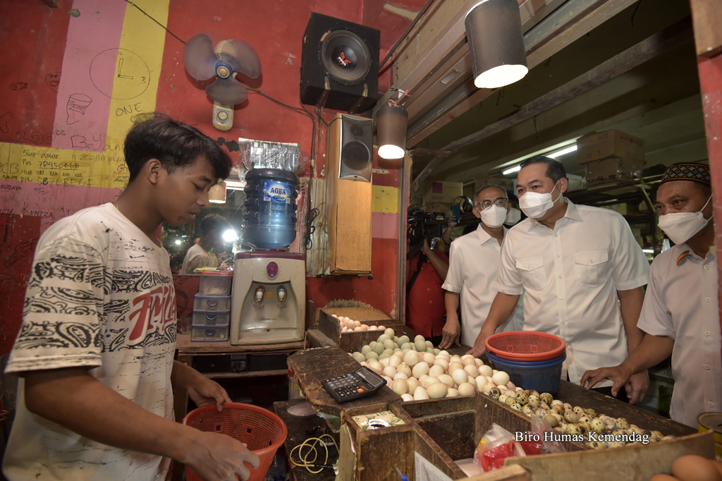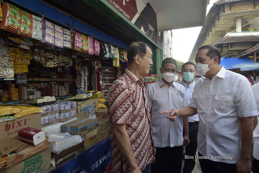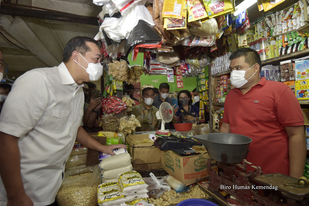 Menteri Perdagangan, Muhammad Lutfi didampingi Direktur Jenderal Perdagangan Dalam Negeri, Oke Nurwan meninjau implementasi penjualan program Minyak Goreng Curah Rakyat (MGCR) di Pasar Kampung Ambon, Jakarta, Selasa (7 Juni).
