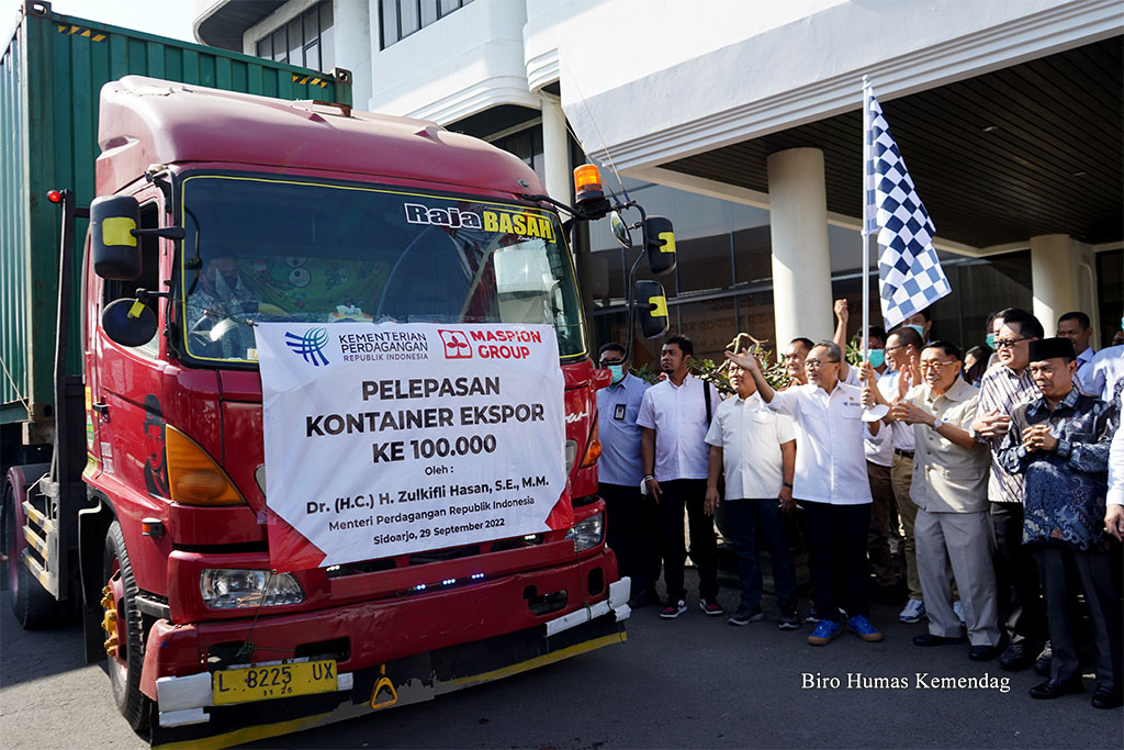 Menteri Perdagangan, Zulkifli Hasan melepas ekspor alumunium ekstrusi PT Maspion Group sebanyak 22 kontainer senilai USD 1,2 juta ke enam negara di Surabaya, Jawa Timur, Kamis (29 Sep).