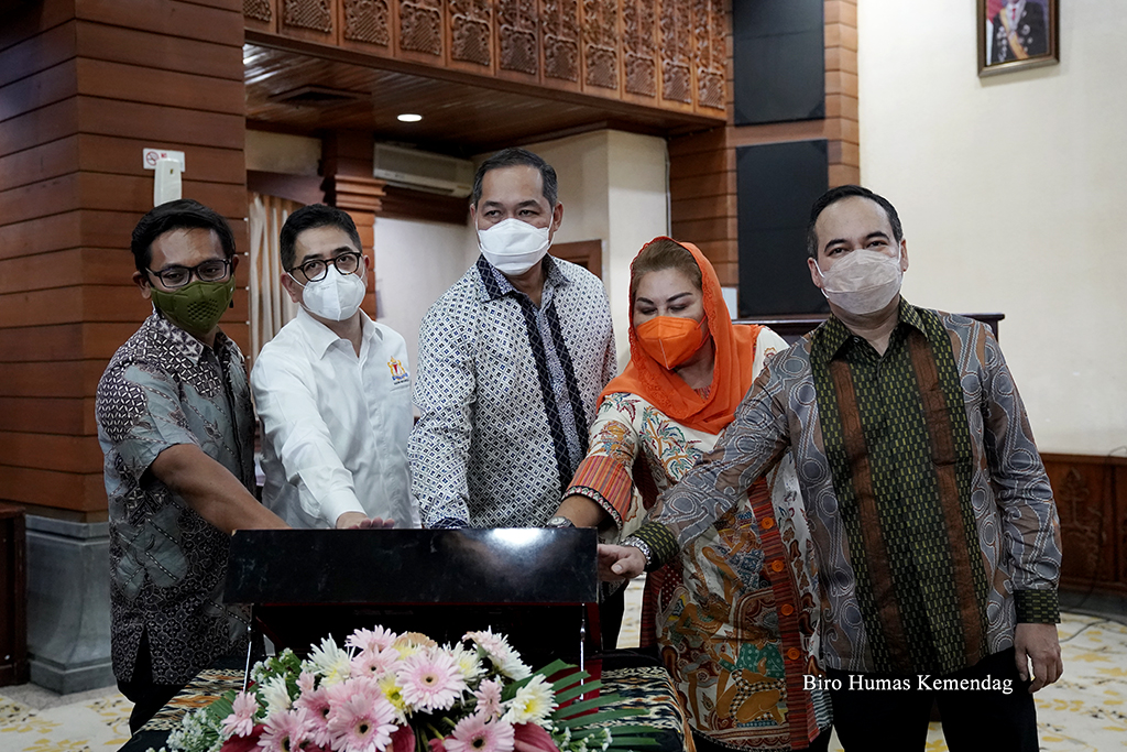 Menteri Perdagangan, Muhammad Lutfi bersama Ketua Umum Kadin Indonesia, Arsjad Rasjid, dan Wakil Wali Kota Semarang, Hevearita G. Rahayu serta Ketua Umum Kadin Jawa Tengah, Kukrit Suryo Wicaksono meluncurkan Program “Kadin Tangkap Peluang” dan “Wiki Info Wirausaha” di Balai Kota Semarang, Jawa Tengah, Rabu (15 Des).