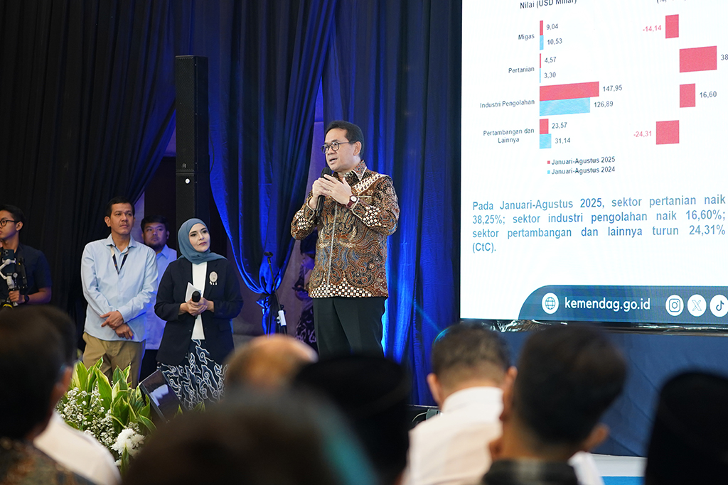 Adapun terkait erkembangan ekspor produk pertanian (pangan), Mendag menyampaikan bahwa pada Januari—Agustus 2025, sektor pertanian naik 38,25%; sektor industri pengolahan naik 16,60%; sektor pertambangan dan lainnya turun 24,31% (CtC).