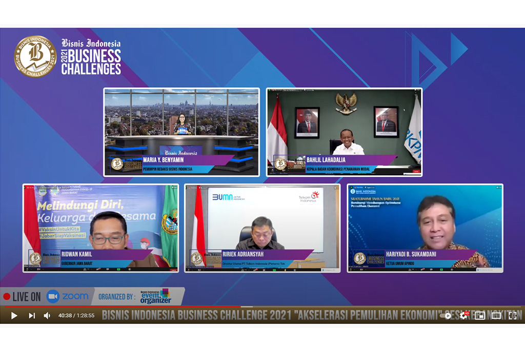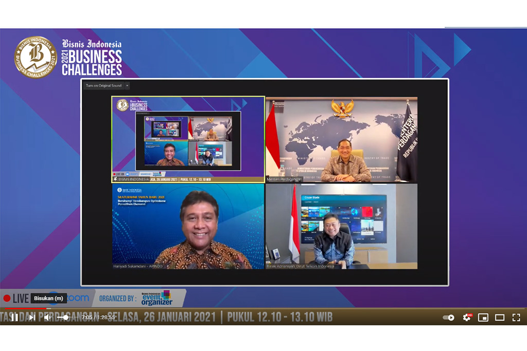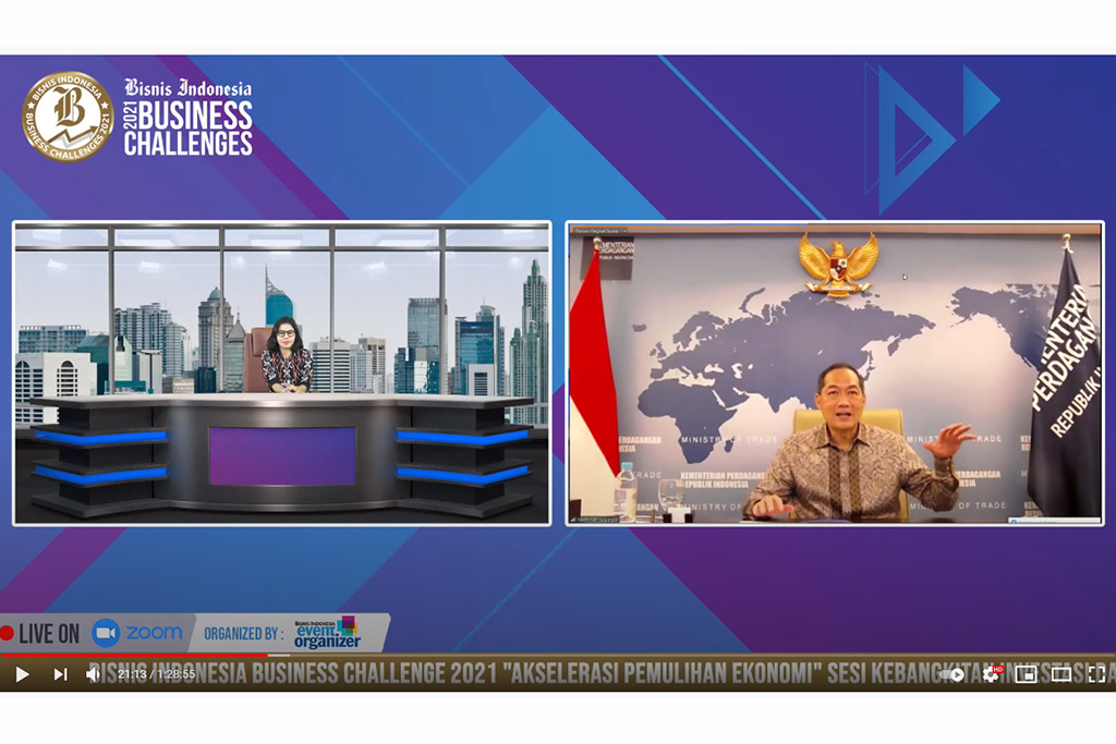 Menteri Perdagangan, Muhammad Lutfi menjadi pembicara pada webinar Business Challenges 2021 yang diselenggarakan oleh Bisnis Indonesia dengan tema "Akselerasi Pemulihan Ekonomi" di Kantor Kementerian Perdagangan, Selasa (26 Jan).
