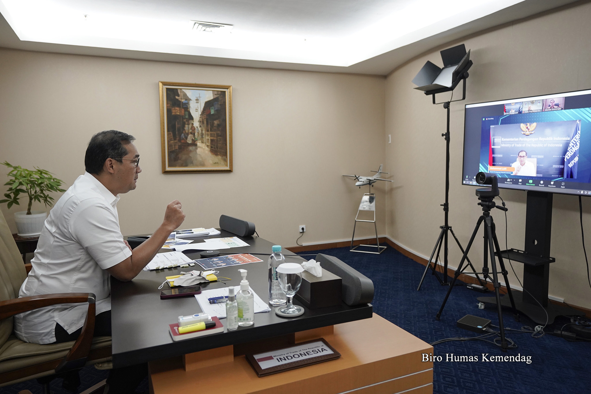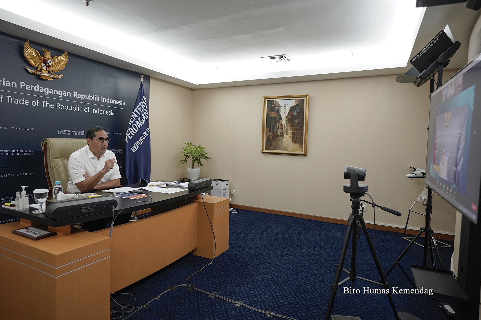 Menteri Perdagangan, Muhammad Lutfi memberikan sambutan pada Webinar Market Outlook dengan tema "Pemulihan Ekonomi Indonesia 1H22 pasca-Covid-19", Jumat (10 Des).