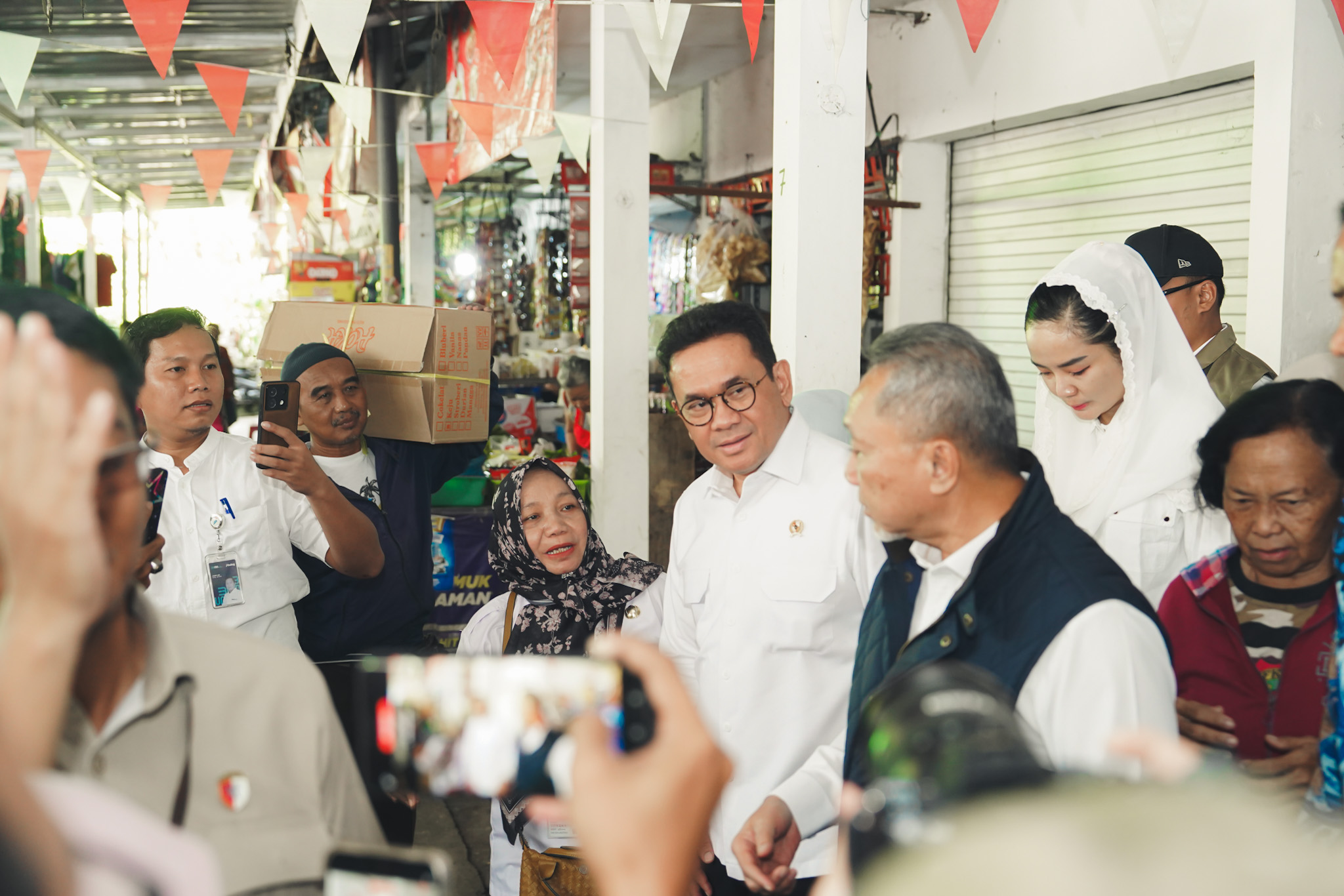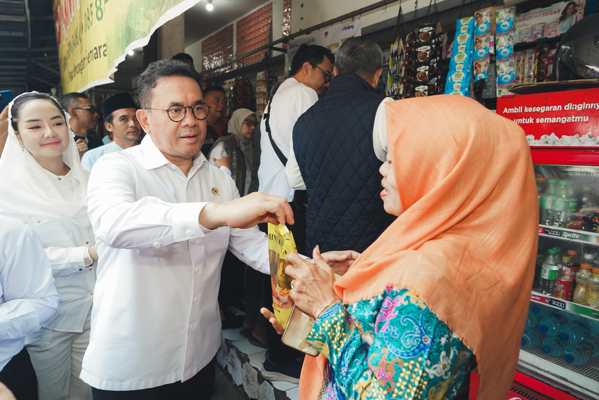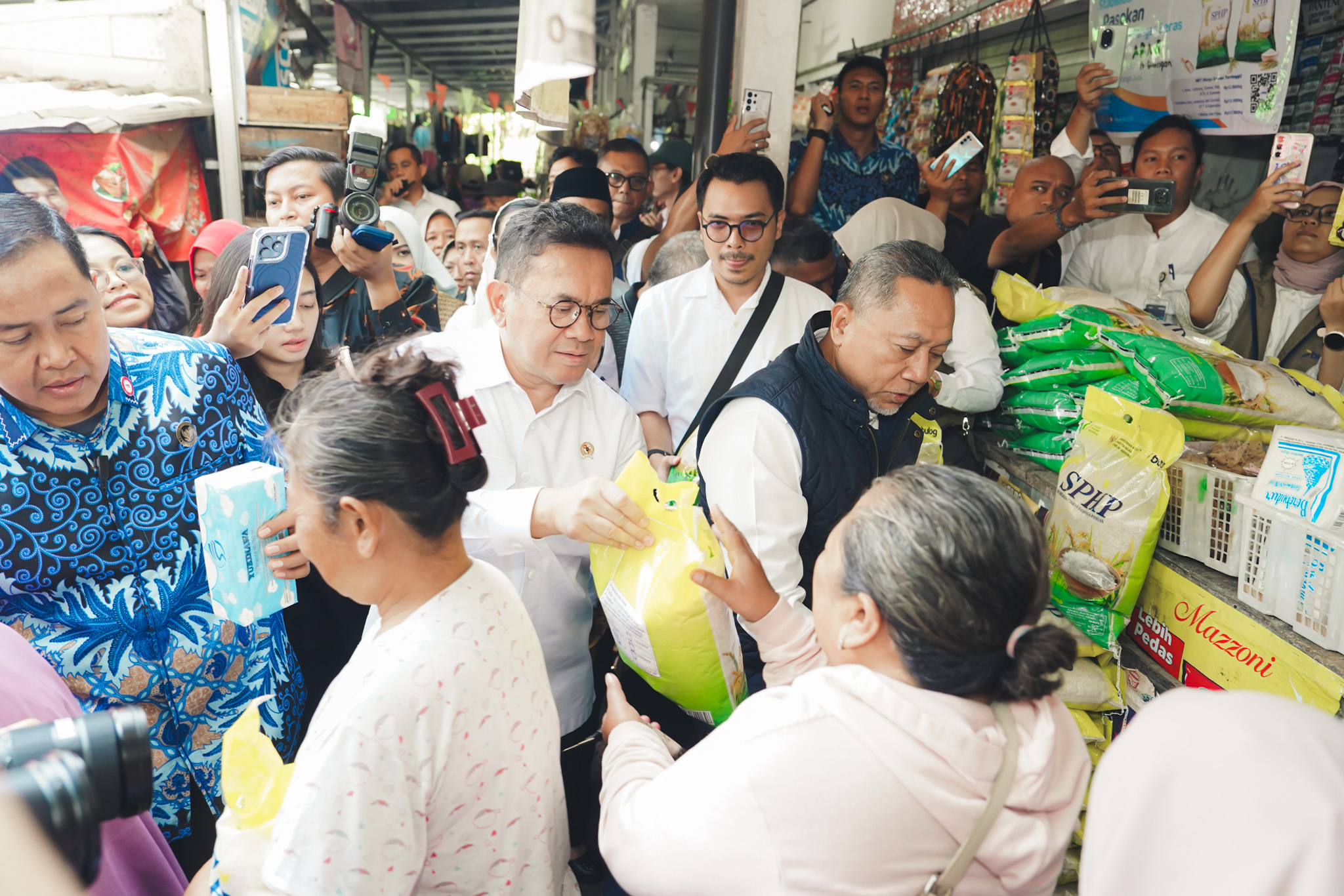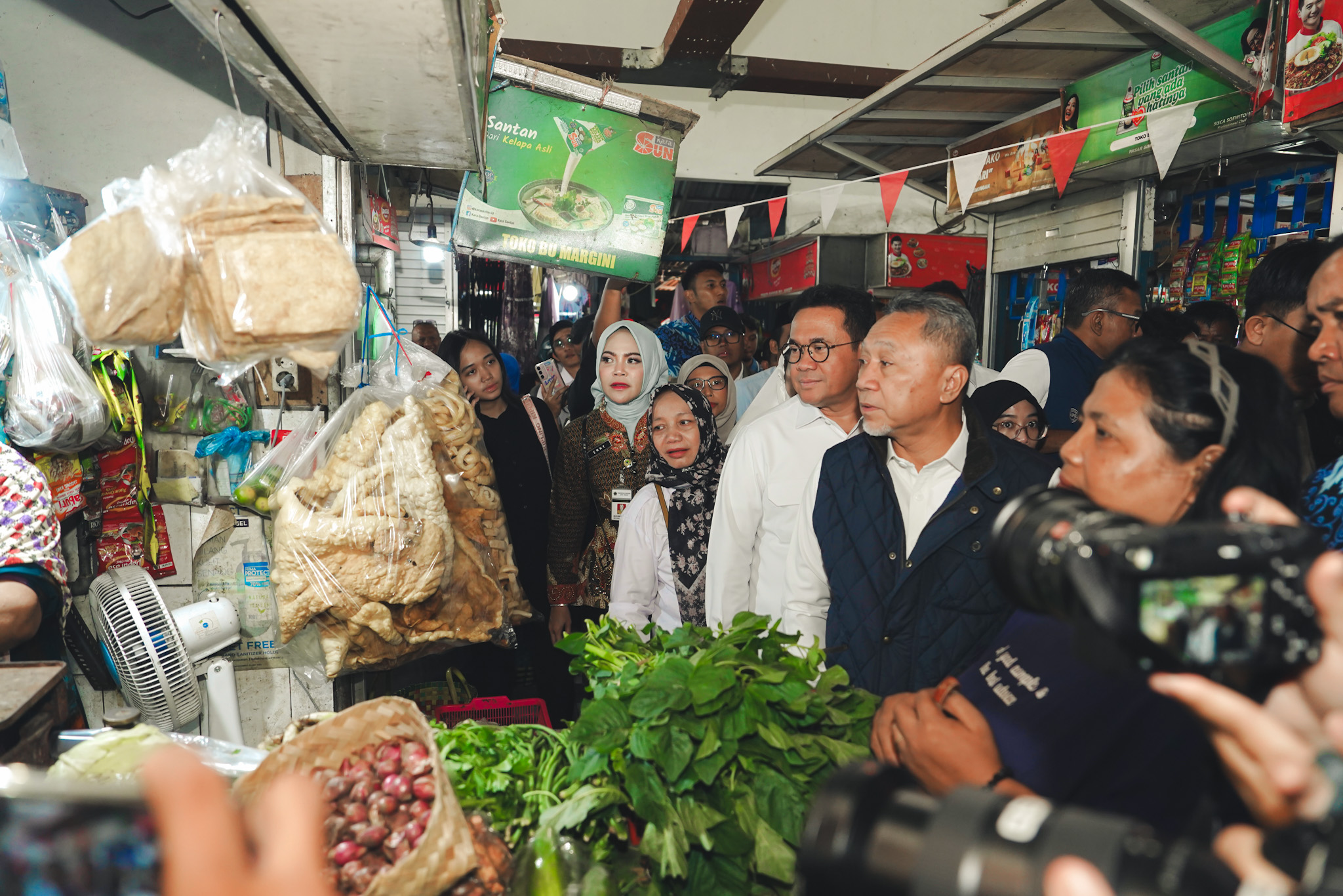 Menteri Perdagangan, Budi Santoso bersama Menteri Koordinator Bidang Pangan, Zulkifli Hasan memantau ketersediaan stok dan stabilitas harga barang kebutuhan pokok (bapok) di Pasar Simongan, Semarang, Jawa Tengah, Jumat (2 Jan).