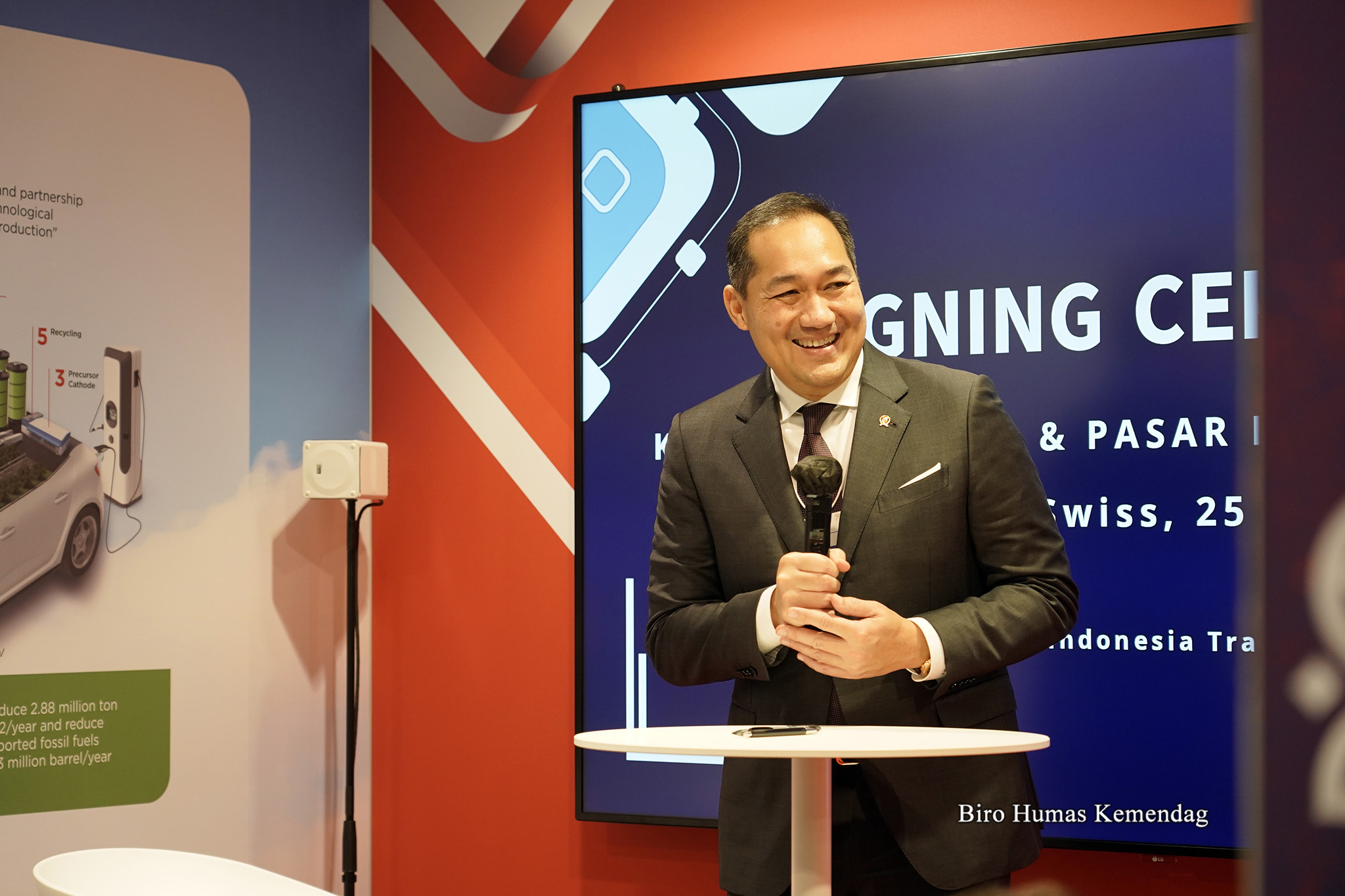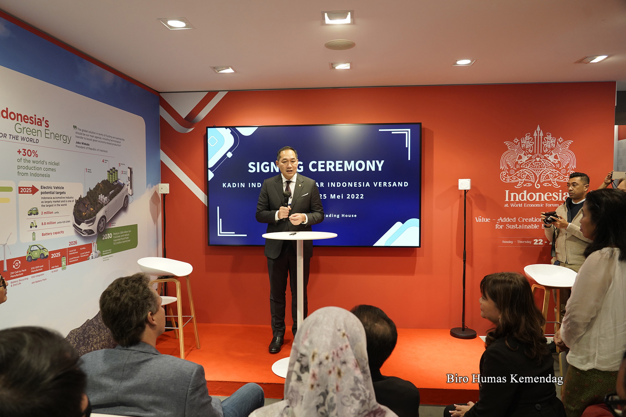 Menteri Perdagangan, Muhammad Lutfi menyaksikan penandatanganan nota kesepahaman (MoU) antara Kamar Dagang dan Industri (Kadin) Indonesia dengan Pasar Indonesia di sela gelaran World Economic Forum (WEF) 2022. Penandatanganan dilakukan di Paviliun Indonesia di Davos Klosters, Swiss, Rabu (25 Mei).