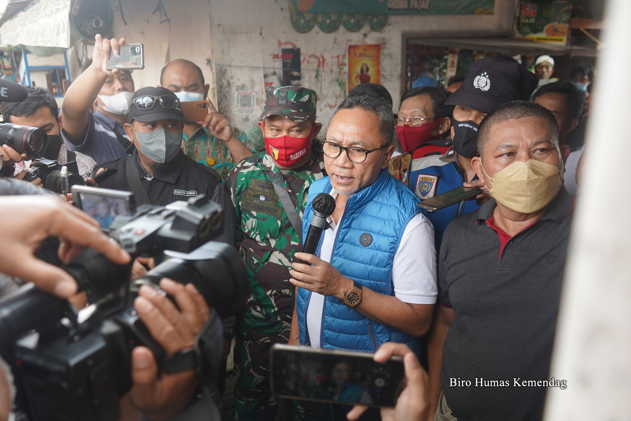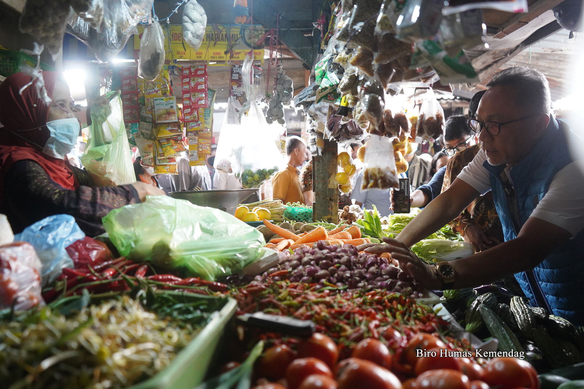 Menteri Perdagangan, Zulkifli Hasan meninjau ketersediaan stok dan stabilitas harga barang kebutuhan pokok (bapok) di Pasar Dukuh Kupang, Surabaya, Minggu (14 Agt).