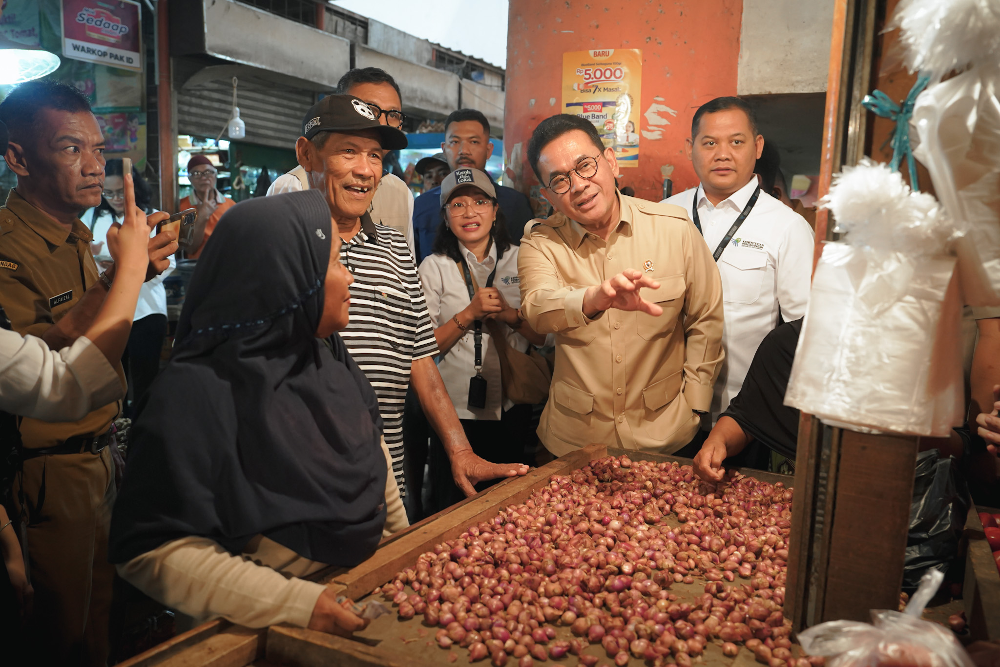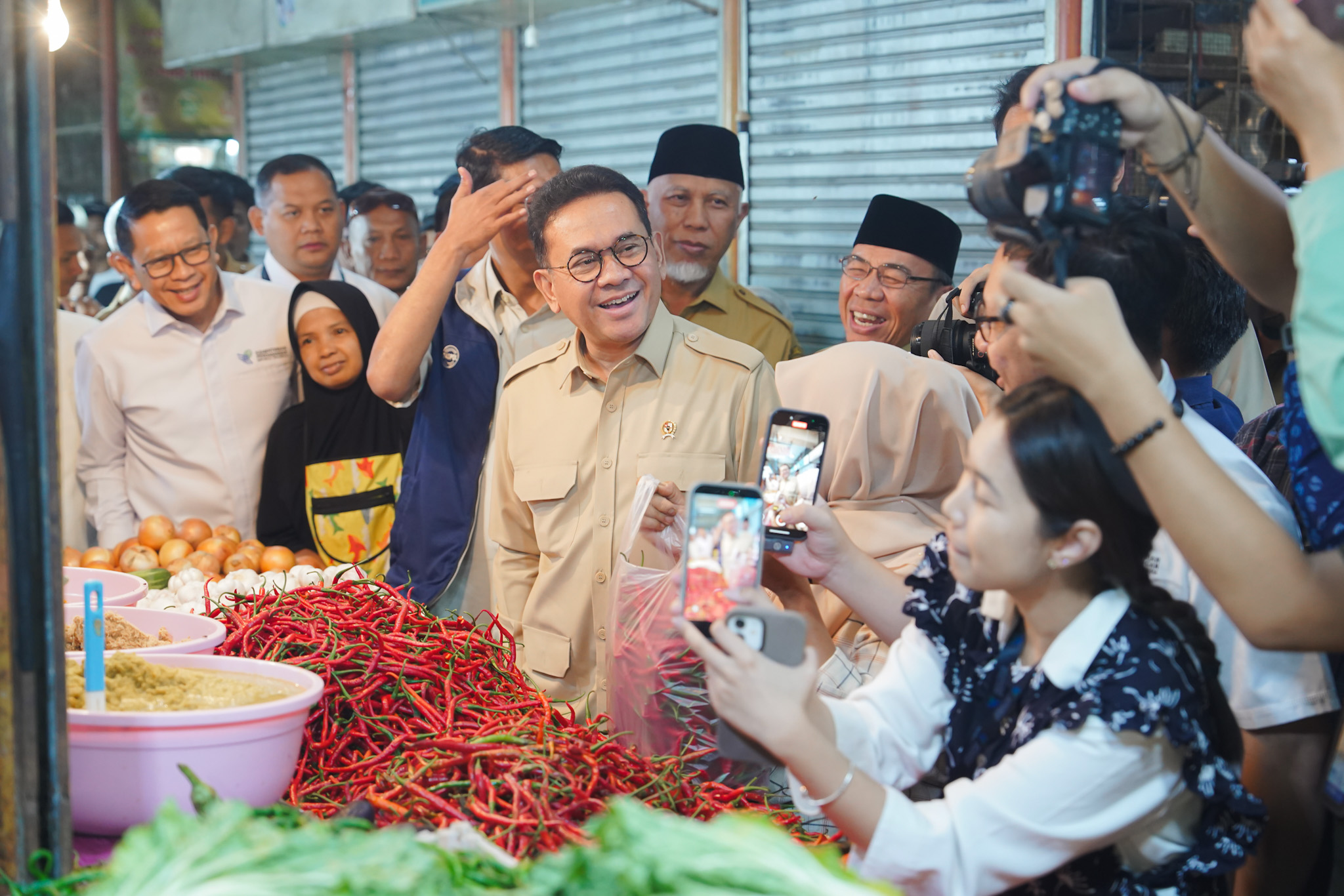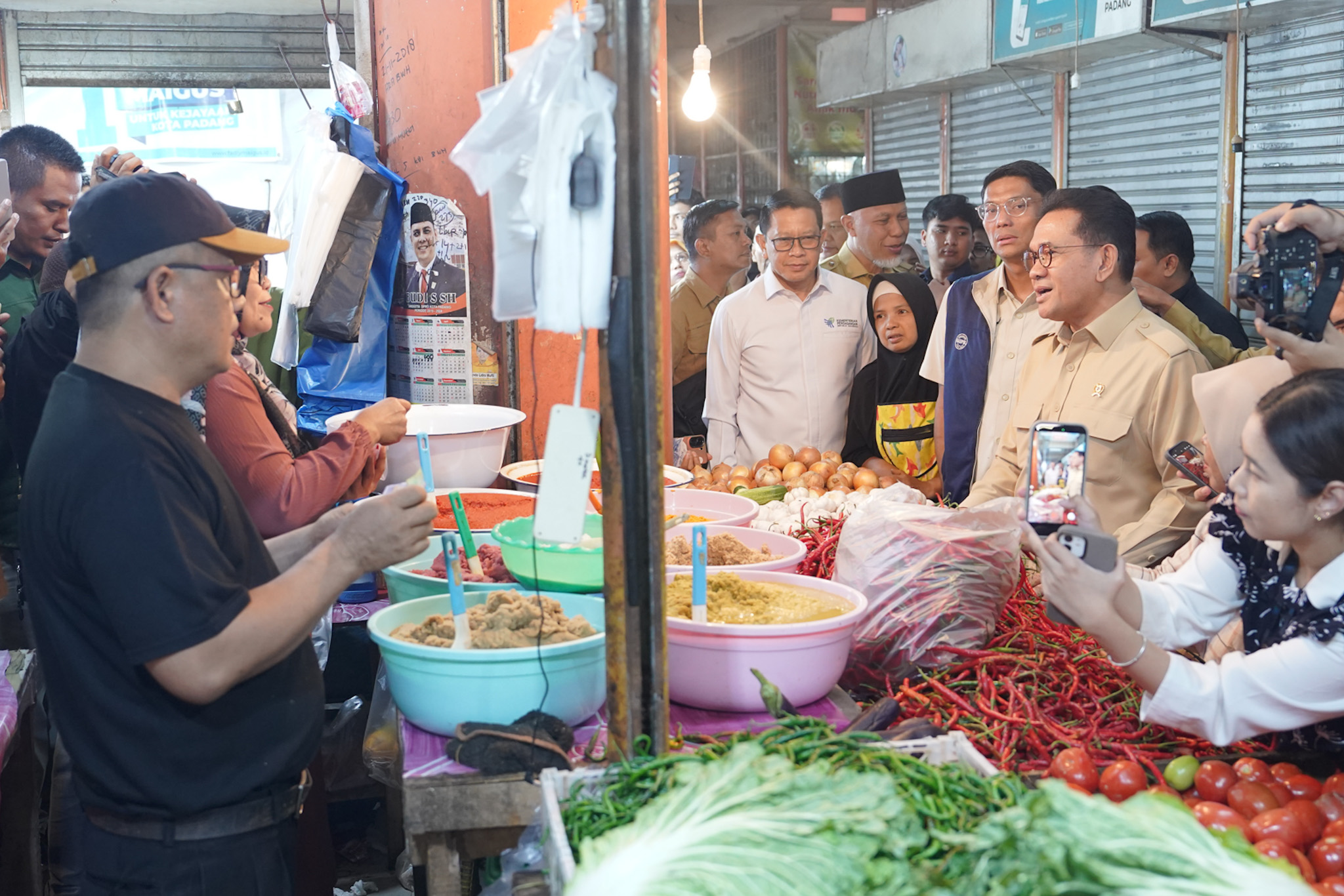 Menteri Perdagangan, Budi Santoso meninjau ketersedian stok dan stabilitas harga barang kebutuhan pokok (bapok) di Pasar Raya Padang, Padang, Sumatra Barat, Selasa (18 Nov).