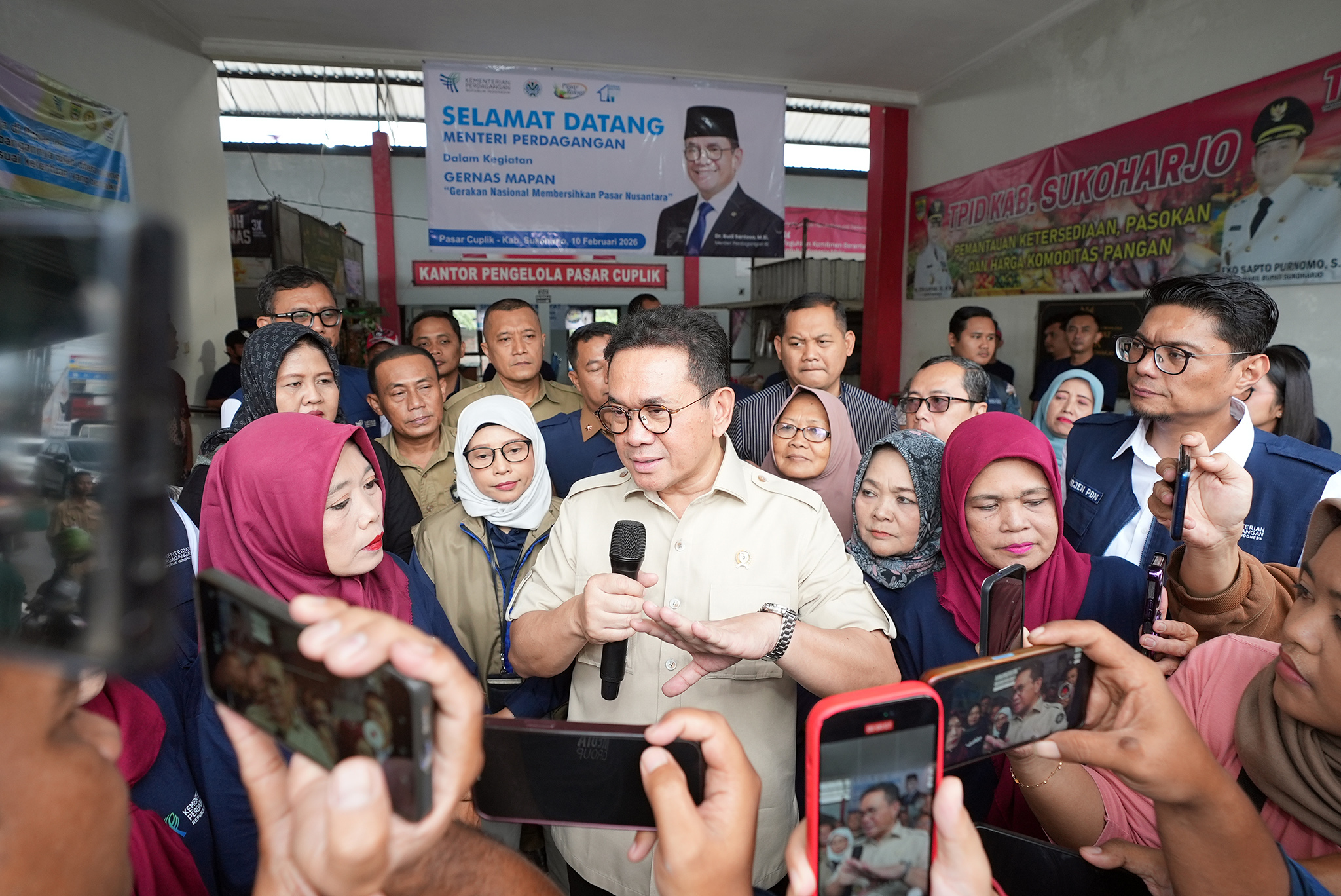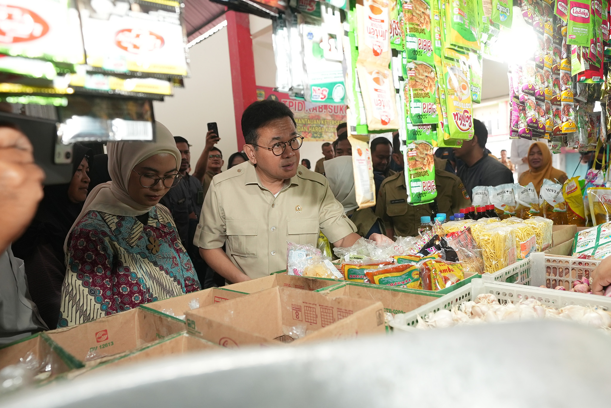 Menteri Perdagangan, Budi Santoso meninjau harga dan ketersediaan barang kebutuhan pokok (bapok) di Pasar Cuplik, Sukoharjo, Jawa Tengah, Selasa (10 Feb).