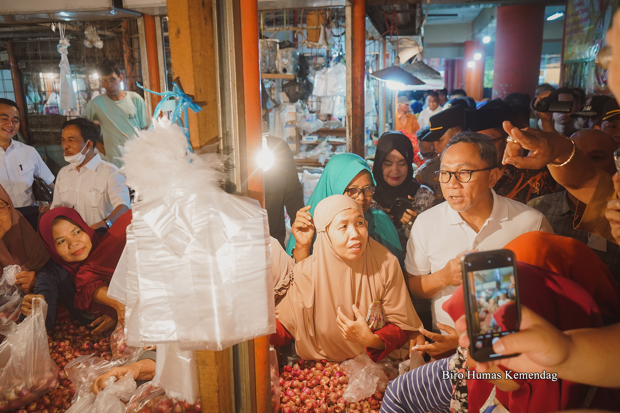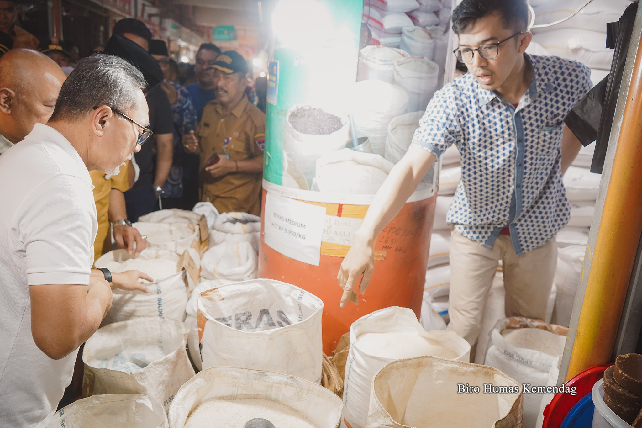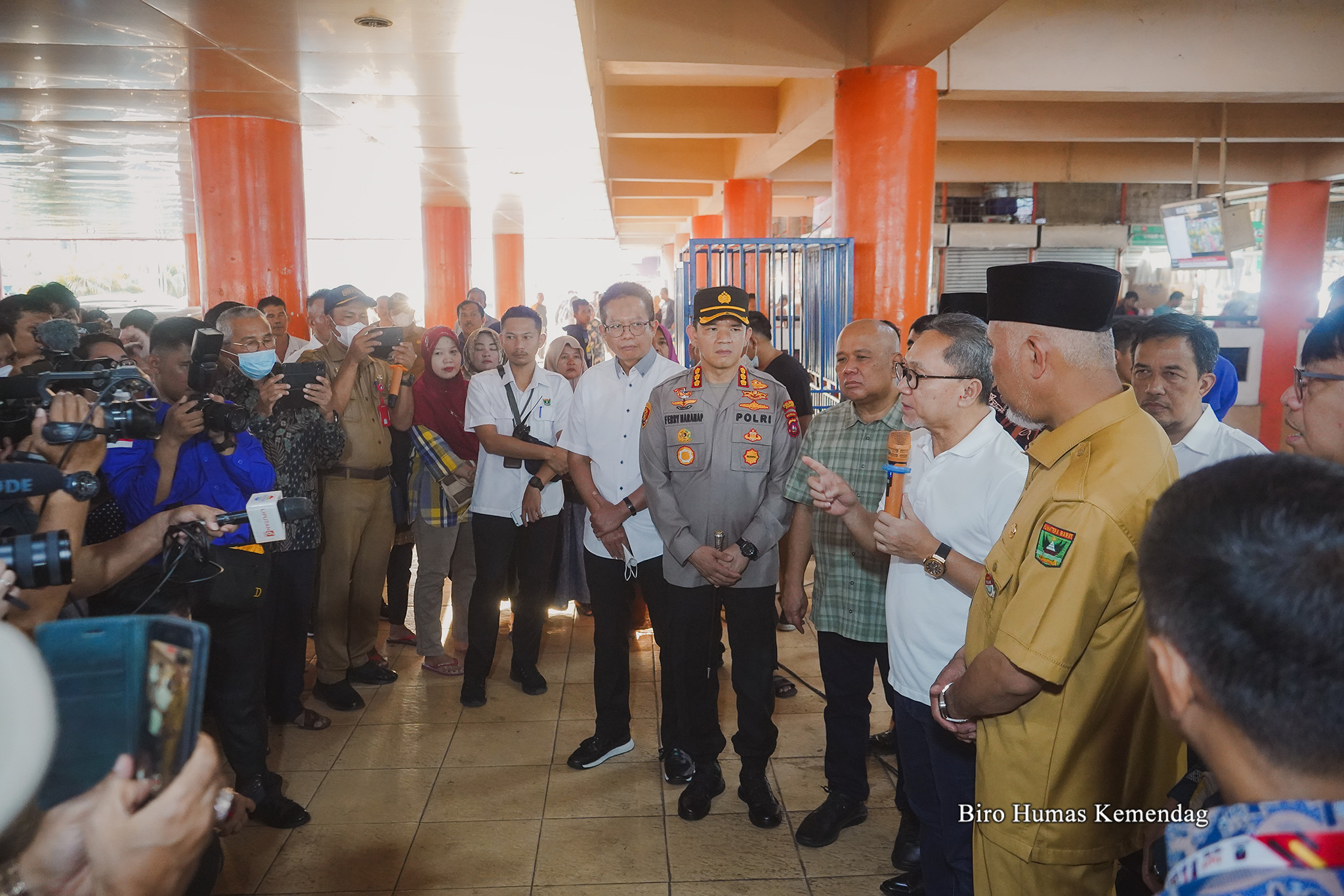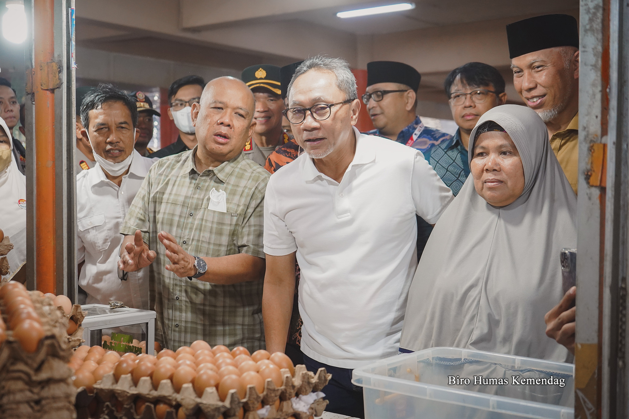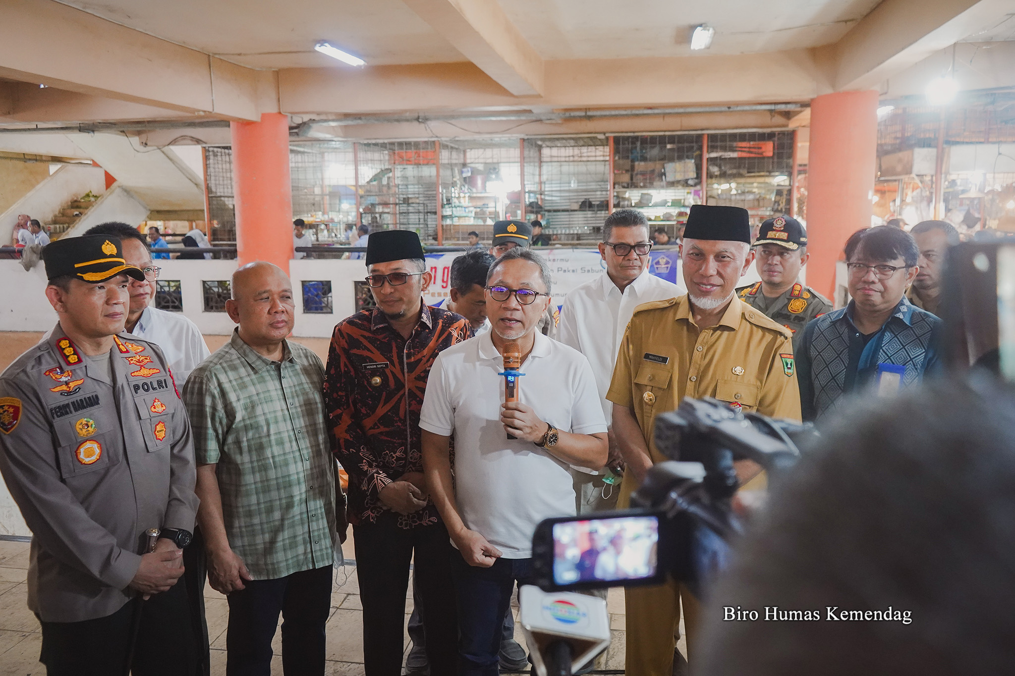Menteri Perdagangan, Zulkifli Hasan bersama Gubernur Sumatra Barat, Mahyeldi Ansharullah dan Wali Kota Padang, Hendri Septa meninjau ketersediaan stok dan stabilitas harga bapok di Pasar Raya, Padang, Sumatra Barat, Senin (8 Agt).