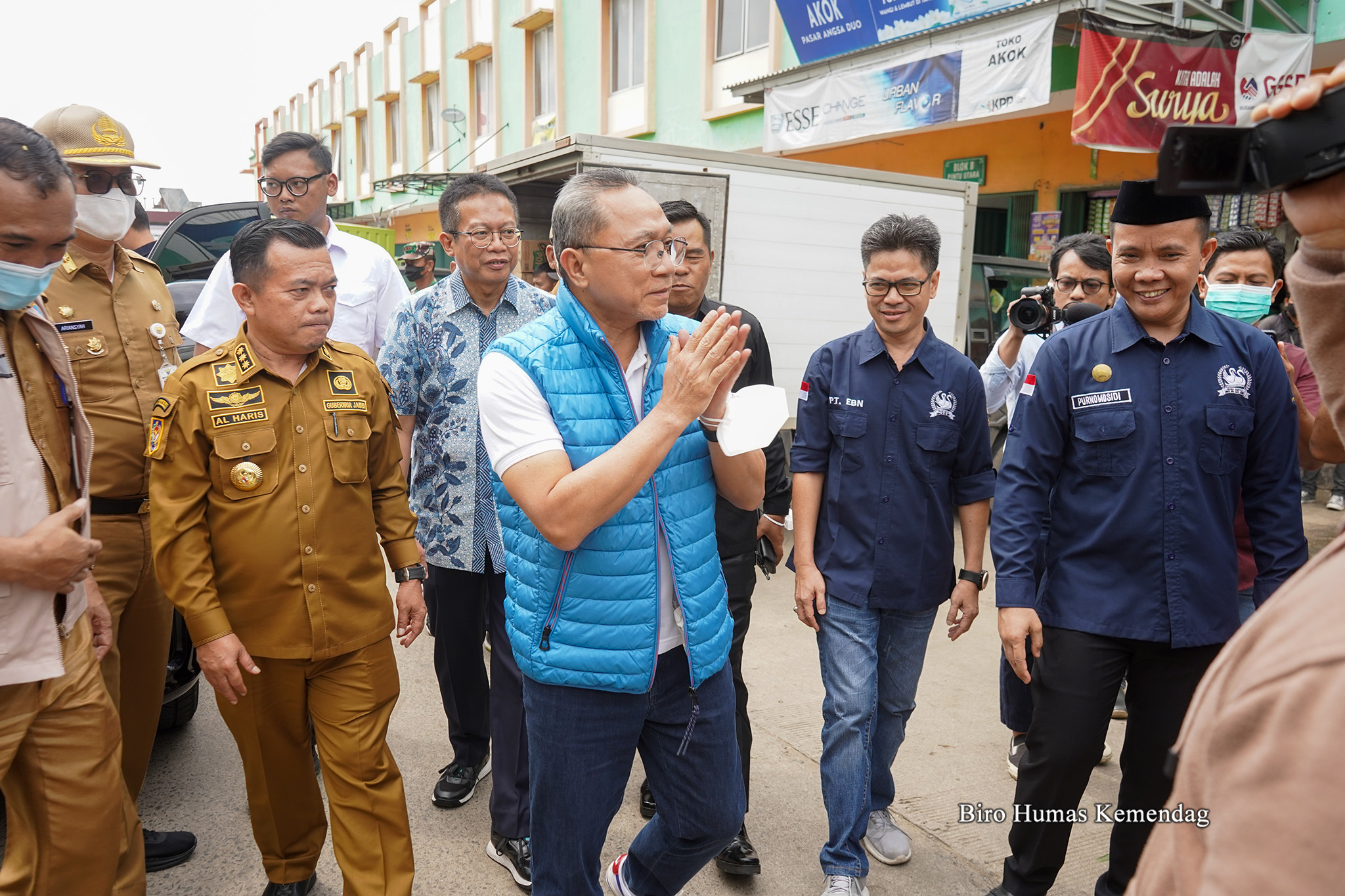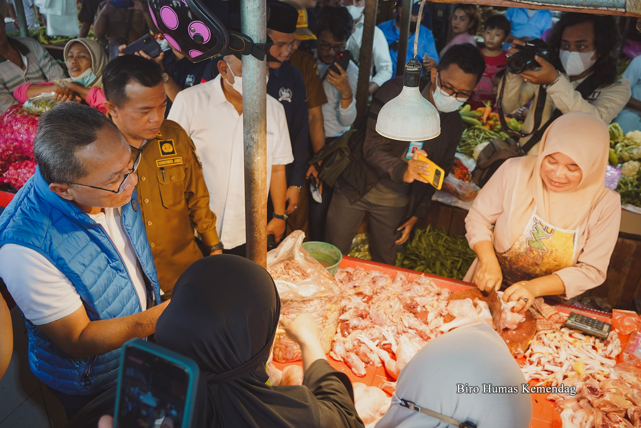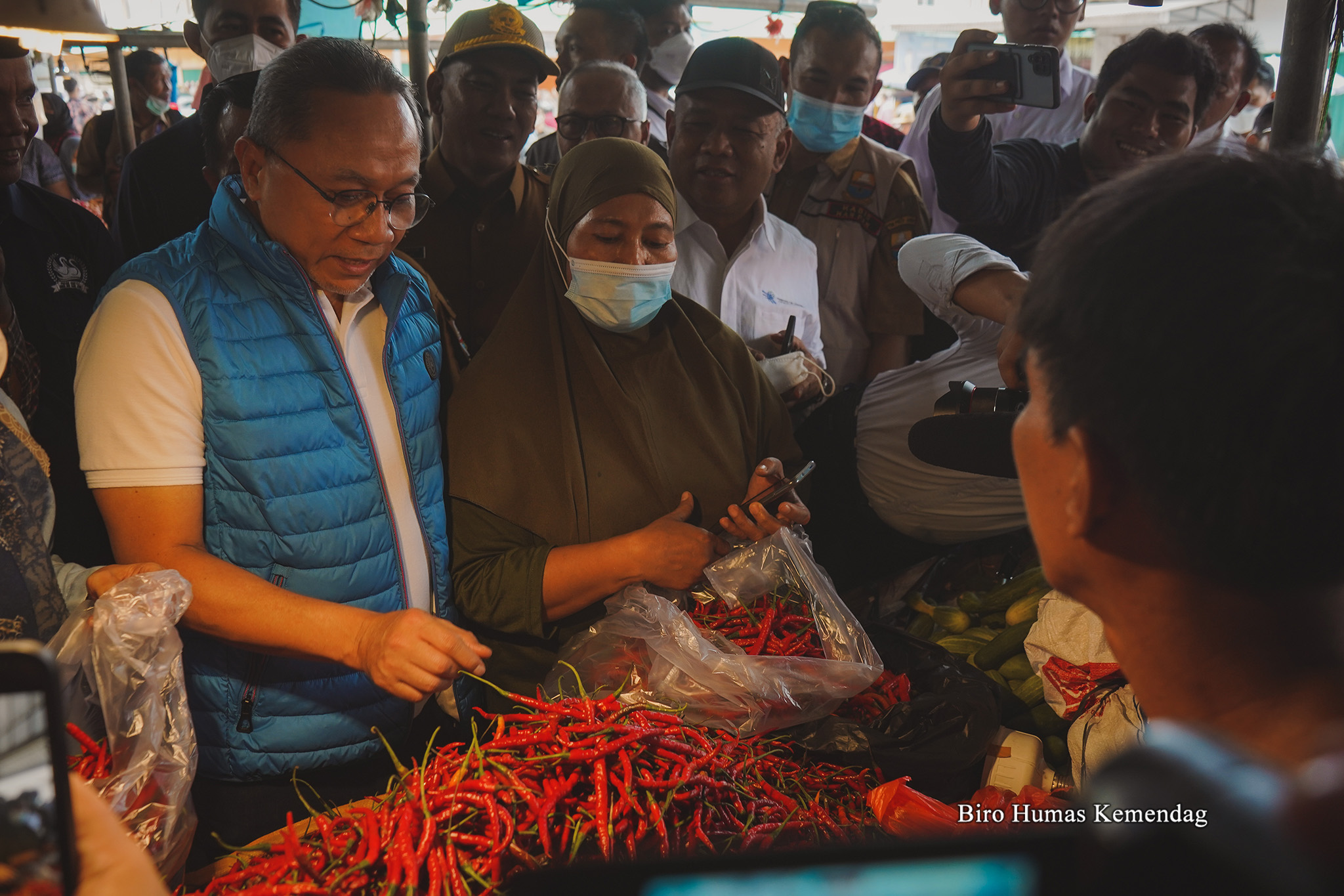 Menteri Perdagangan, Zulkifli Hasan bersama Gubernur Provinsi Jambi, Al Haris meninjau ketersediaan stok dan stabilitas harga barang kebutuhan pokok (bapok) di Pasar Angso Duo, Jambi, Selasa (2 Agt).