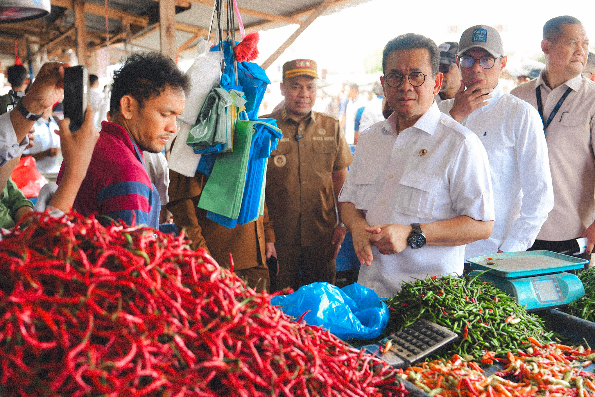 Menteri Perdagangan, Budi Santoso meninjau barang kebutuhan pokok (bapok) di Pasar Pante Teungoh, Kabupaten Pidie, Aceh, Senin (23 Feb). Tinjauan ini dilakukan dalam rangka persiapan lebaran 2026.