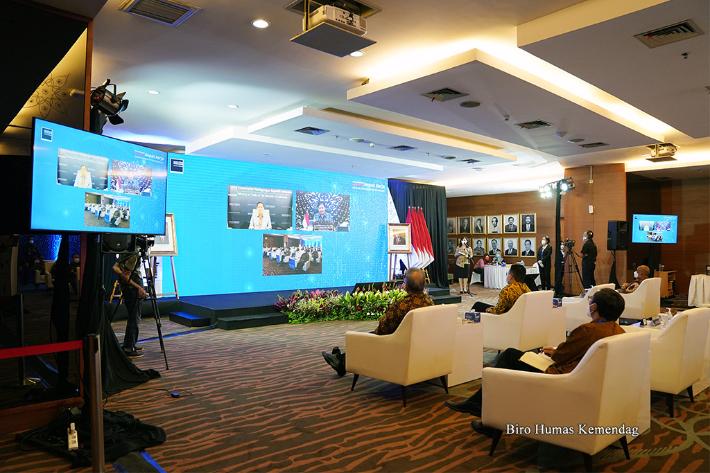 Dalam paparannya, Menko Perekonomian menyampikan bahwa pada 2020, neraca perdagangan surplus USD 21,74 miliar, tertinggi sejak 2011. Catatan positif tersebut berlanjut di Januari 2021 di mana neraca perdagangan Indonesia mengalami surplus USD 1,96 miliar (9 bulan berturut-turut).