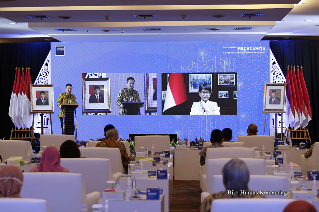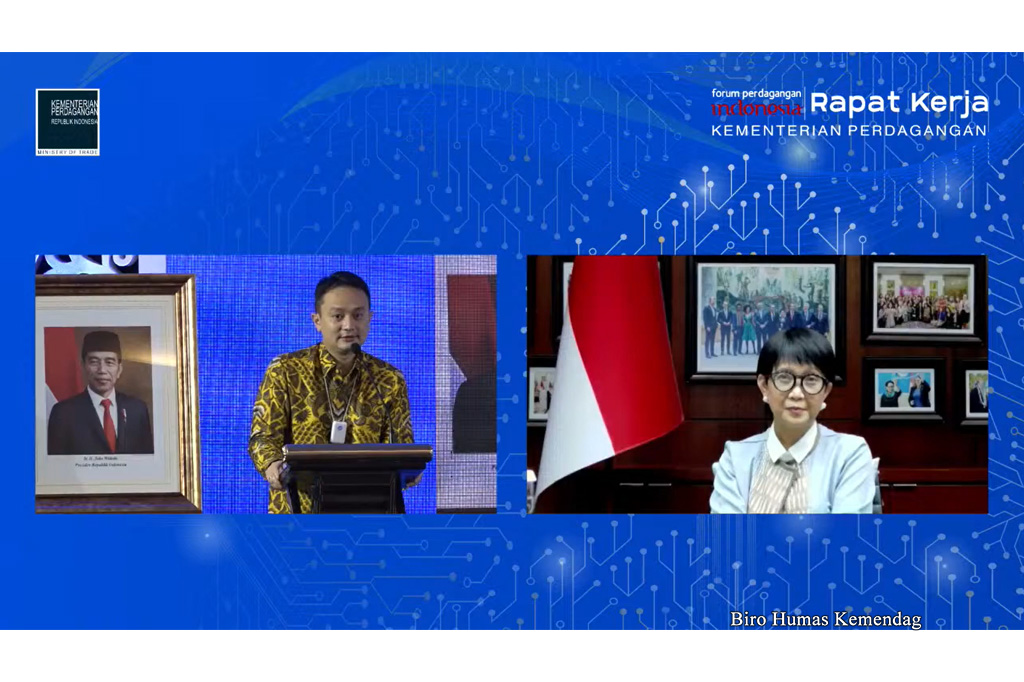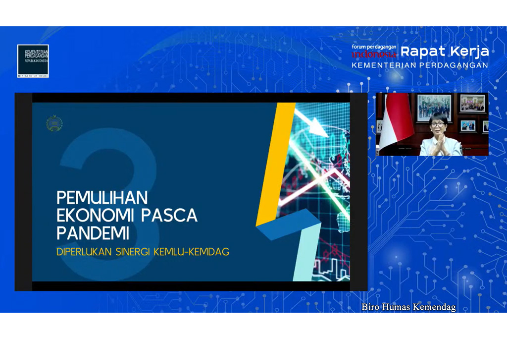 Menteri Luar Negeri, Retno L.P. Marsudi menjadi narasumber pada Rapat Kerja Kementerian Perdagangan Tahun 2021 yang dilaksanakan secara virtual, Kamis (4 Mar). Sesi ini dimoderatori oleh Wakil Menteri Perdagangan, Jerry Sambuaga.