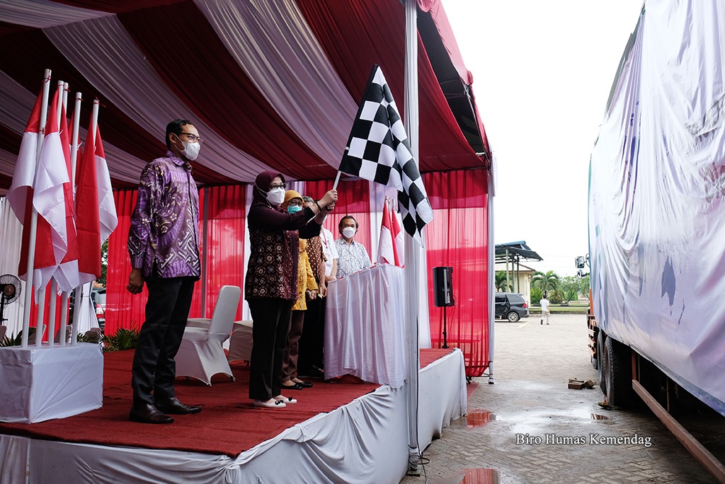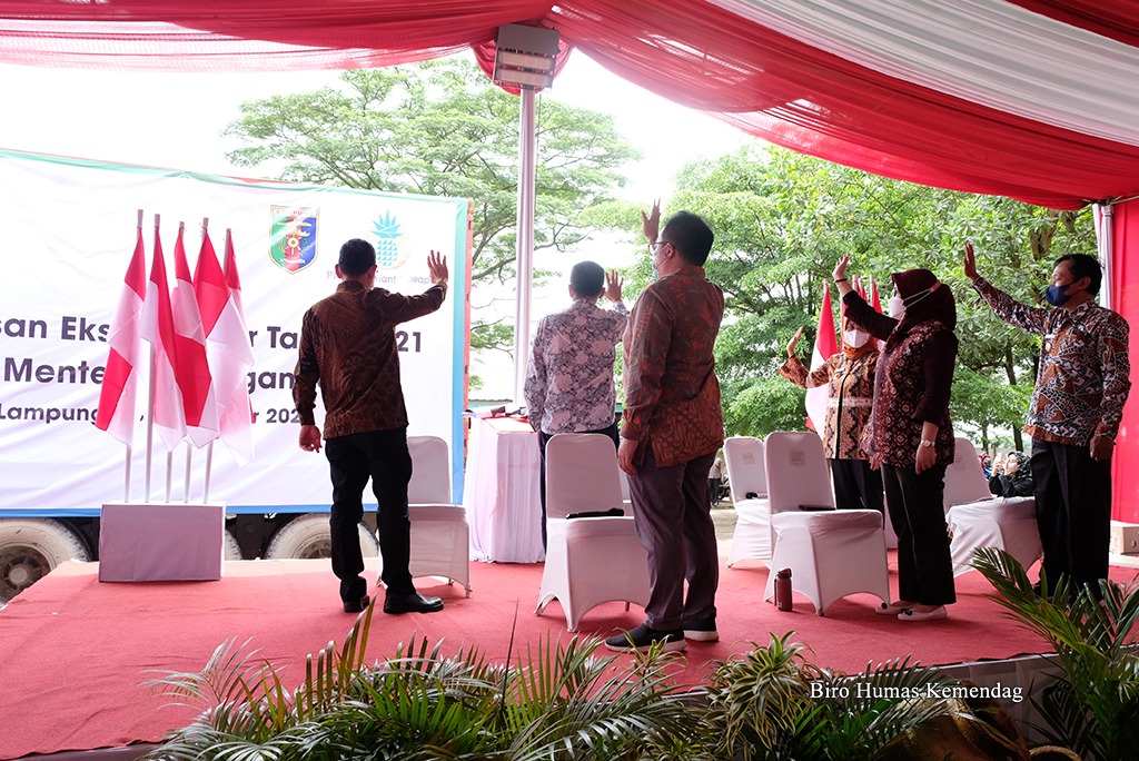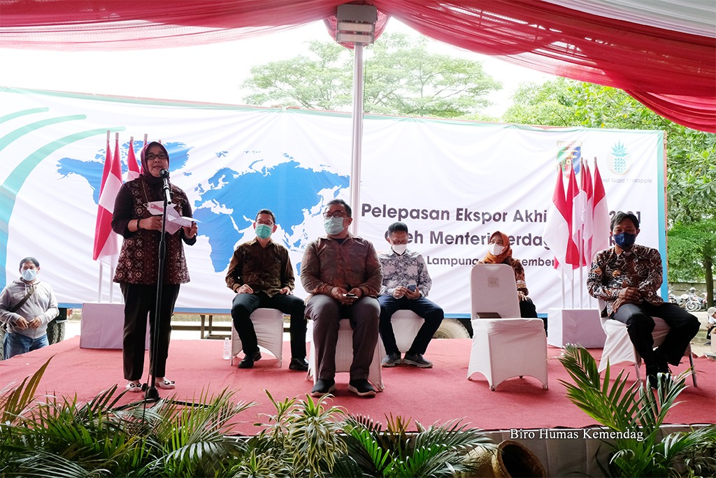 Staf Ahli Menteri Perdagangan Bidang Hubungan Internasional, Arlinda bersama Plt. Asisten Bidang Perekonomian dan Pembangunan Sekretariat Provinsi Lampung, Kusnardi; Kepala Dinas Perindustrian dan Perdagangan Provinsi Lampung, Elvira Umihanni; serta perwakilan dari PT Great Giant Pineapple, Indra Ardianto melakukan pelepasan ekspor akhir tahun 2021 secara hibrida di Lampung, Kamis (23 Des).