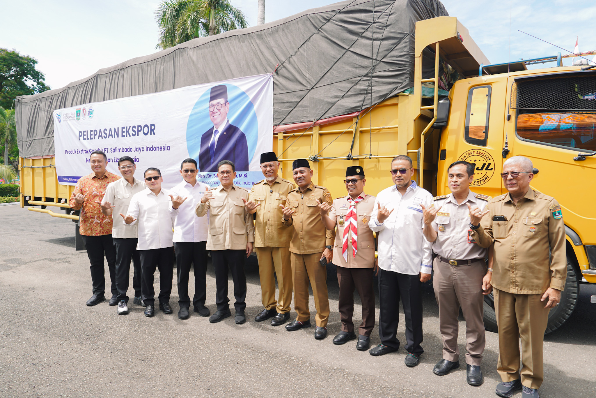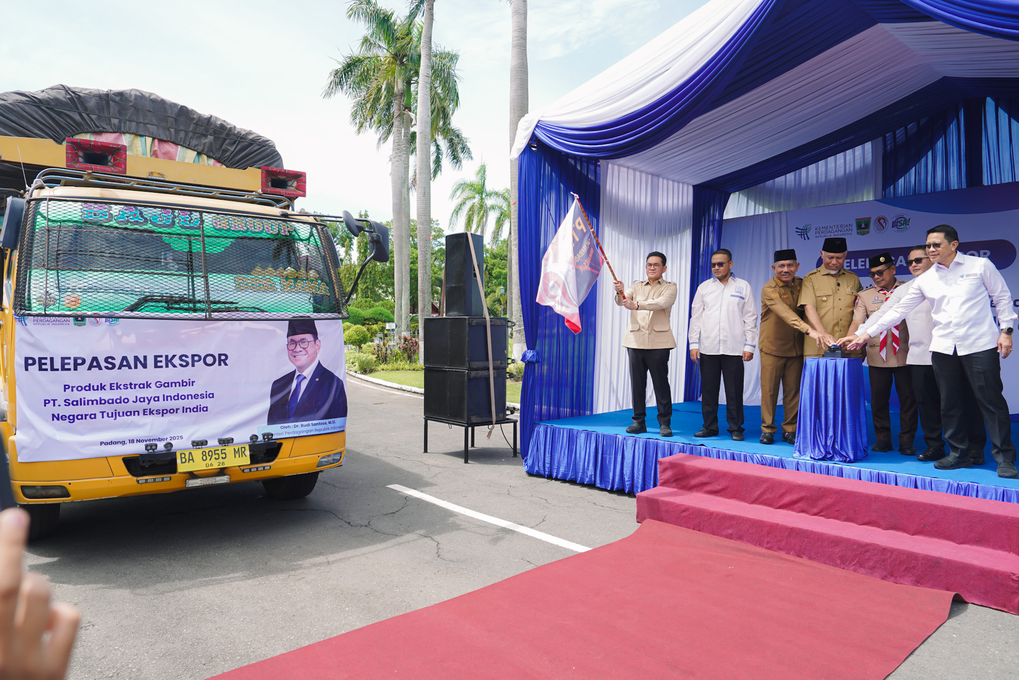 Menteri Perdagangan, Budi Santoso bersama Gubernur Sumatra Barat, Mahyeldi Ansharullah dan Wakil Wali Kota Padang, Maigus Nasir melepas ekspor produk gambir dari PT Salimbado Jaya Indonesia yang berlangsung di Halaman Istana Gubernur Sumatra Barat, Padang, Sumatra Barat, Selasa (18 Nov).