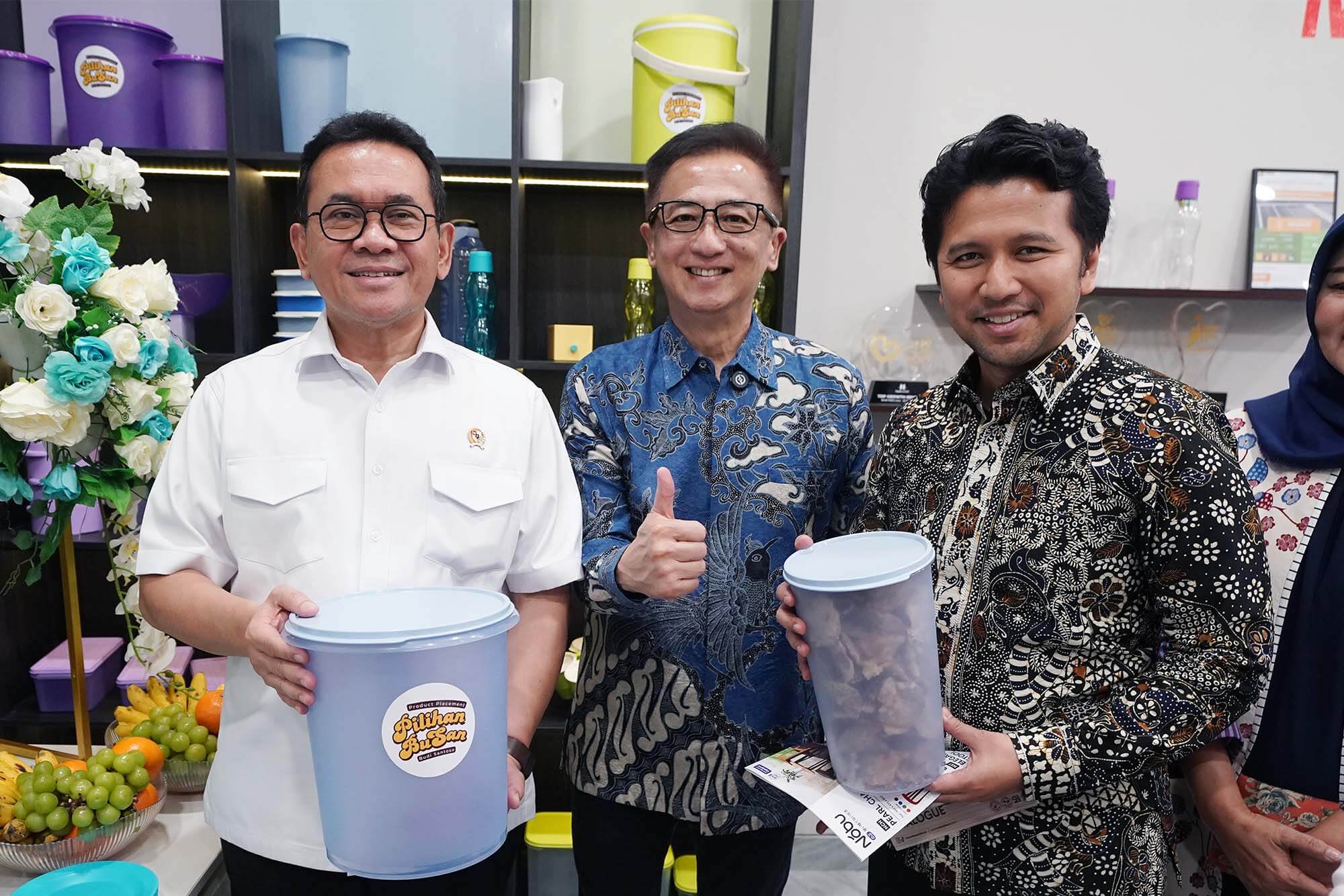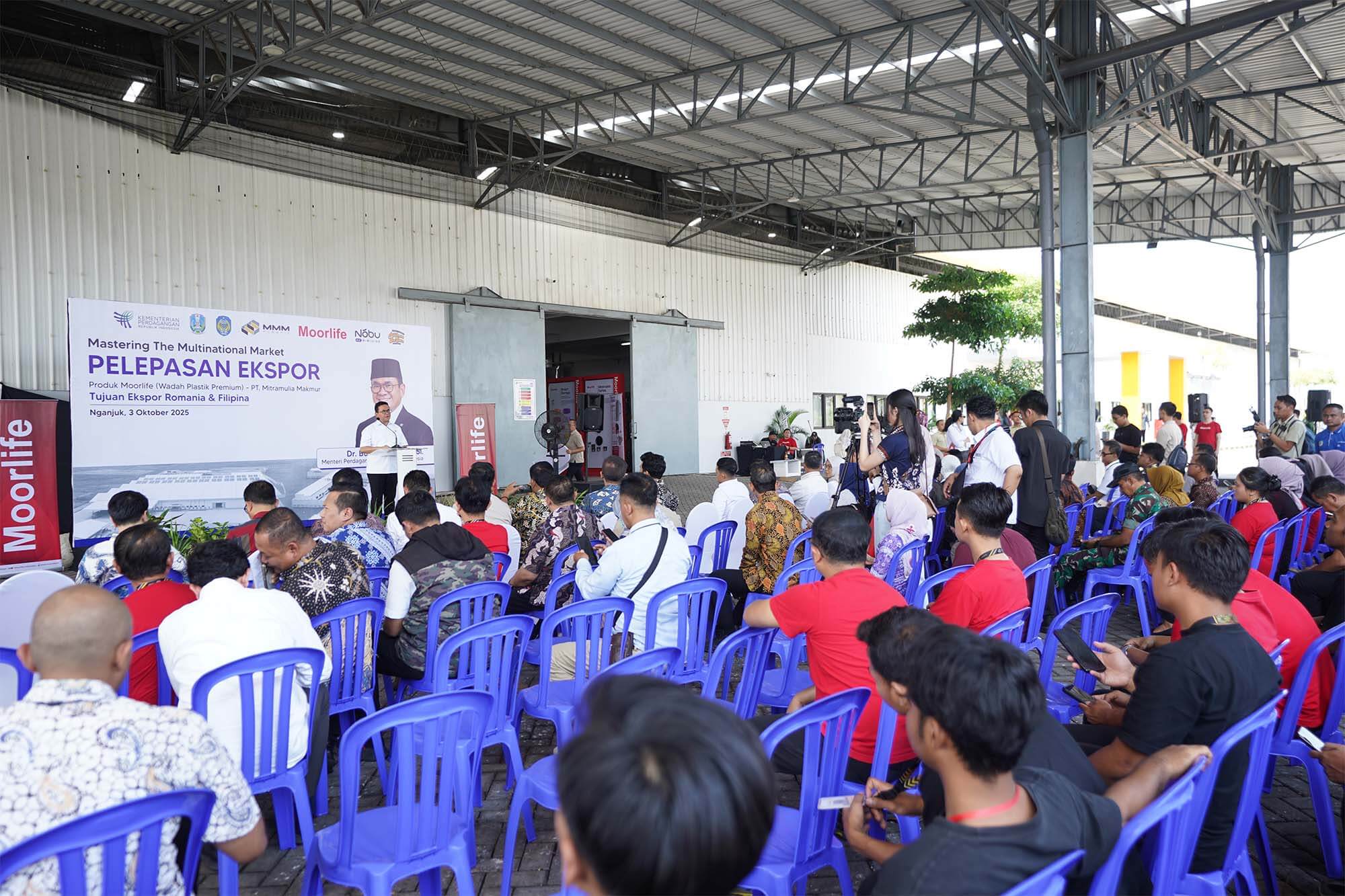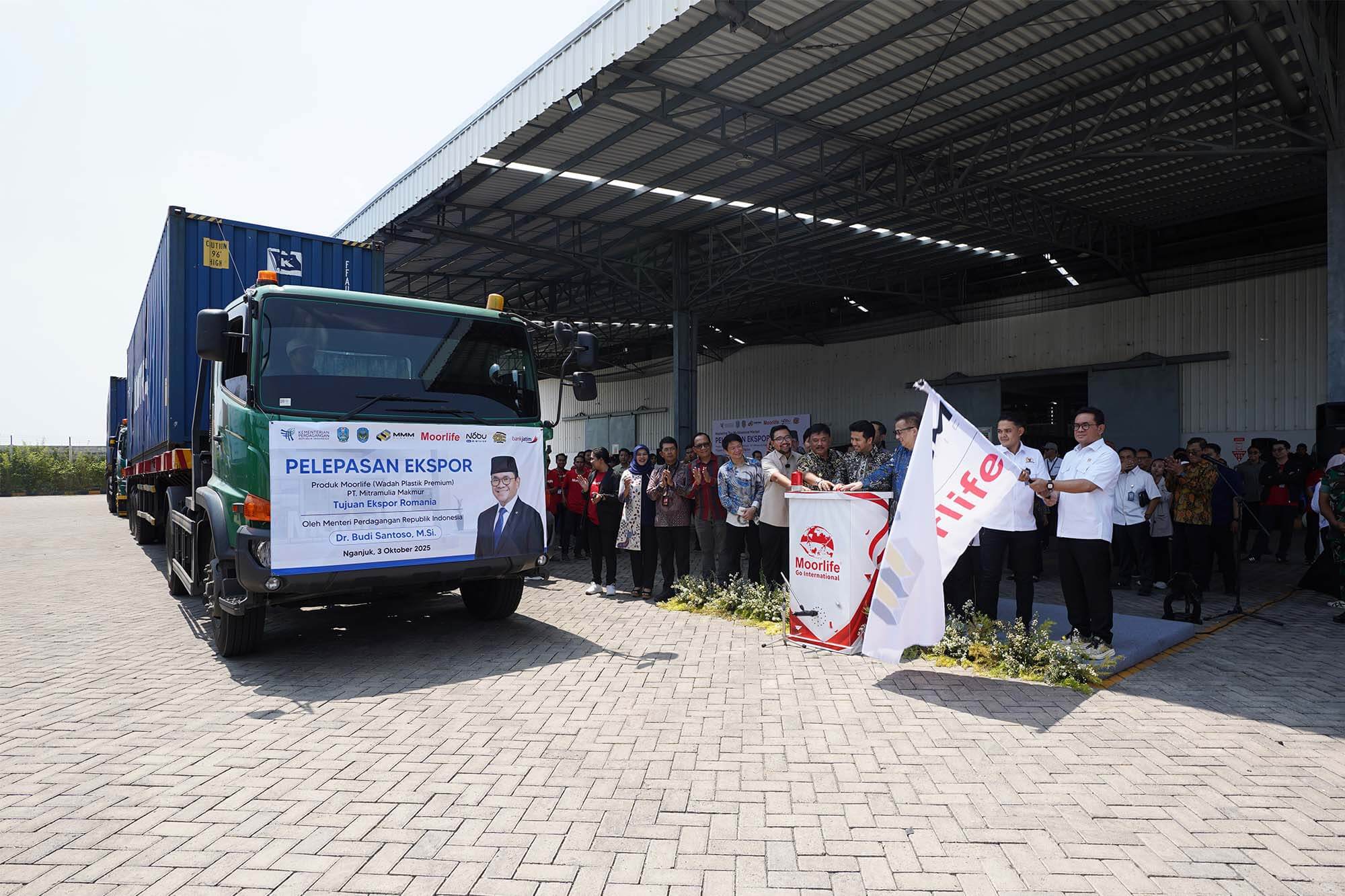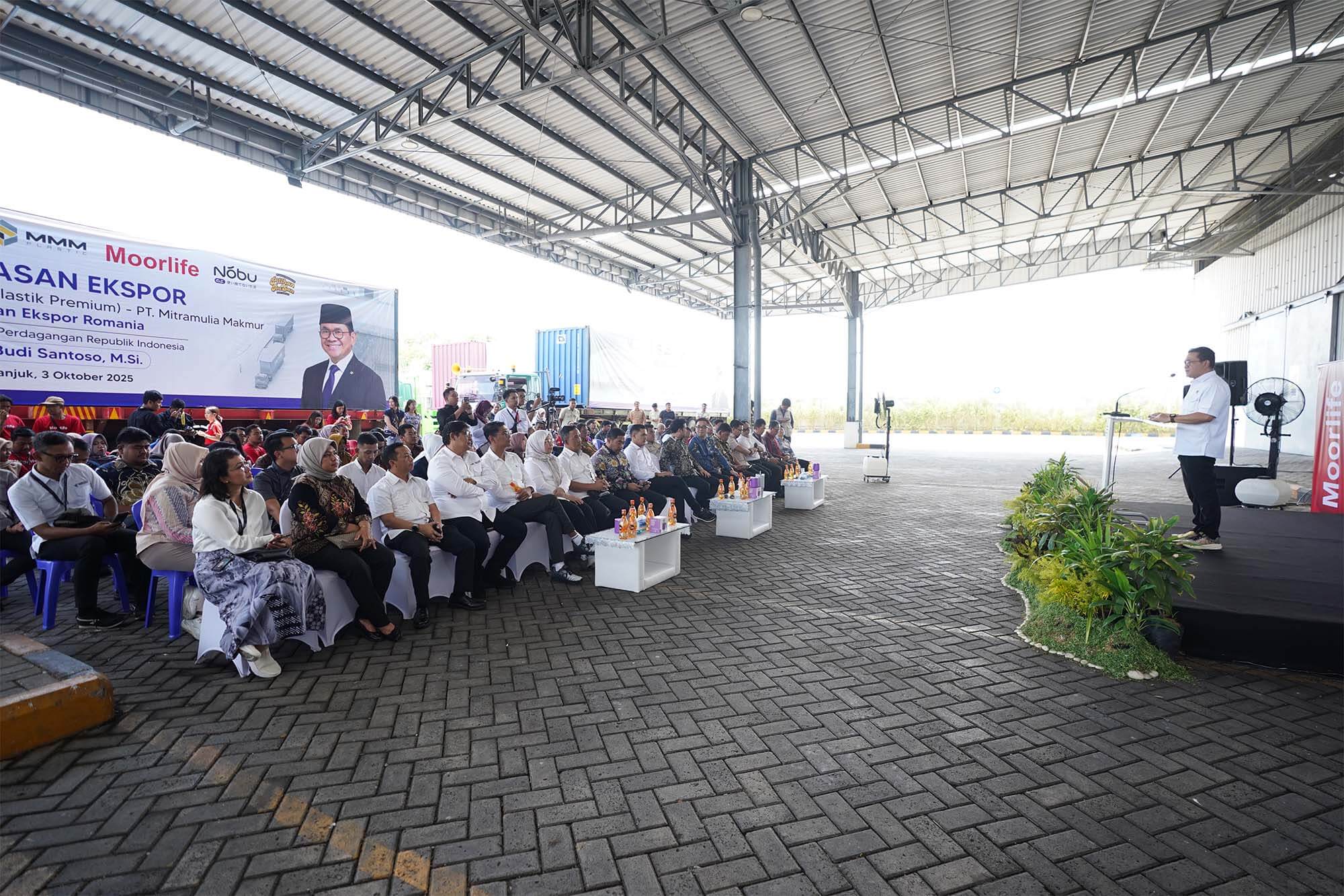 Menteri Perdagangan, Budi Santoso melepas ekspor 4 kontainer produk peralatan rumah tangga berbahan plastik produksi PT Mitramulia Makmur (MMM) ke Filipina dan perdana ke Romania dengan merk Moorlife senilai USD 411,73 ribu (Rp6,7 miliar) di Kabupaten Nganjuk, Jawa Timur, Jumat (3 Okt).