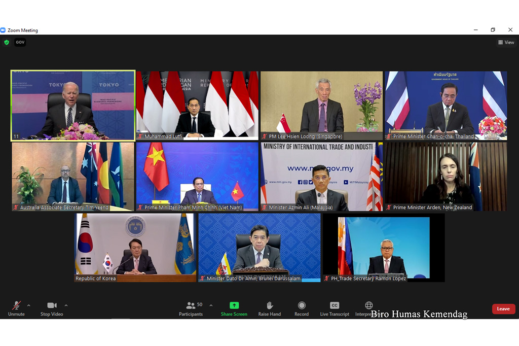 Menteri Perdagangan RI, Muhammad Lutfi mewakili Presiden RI, Joko Widodo menghadiri Peluncuran Indo-Pacific Economic Framework (IPEF) secara virtual, Senin (23 Mei).