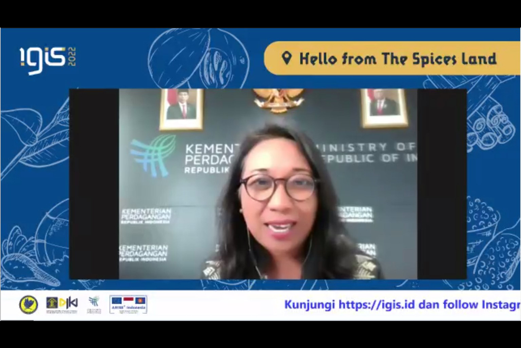 Direktur Kerja Sama Pengembangan Ekspor, Ni Made Ayu Marthini memberikan sambutan dalam Webinar Peluncuran Indonesia’s Geographical Indication Show (IGIS) 2022 pada Jumat (13 Mei).